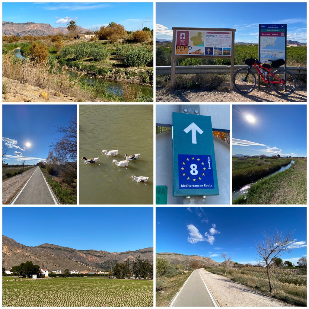 Sin embargo, después de un breve descanso decido alargar la etapa recorriendo los 22 kilómetros que separan Orihuela de Murcia. Para ello tomo un sendero que va paralelo todo el rato al río Segura y que está señalizado como el Camino de la Cruz de Caravaca. Es un paseo agradable rodeado constantemente de campos de cultivo. Una parte del trayecto, aproximadamente la mitad, es un magnífico carril-bici pavimentado y, unido a que es prácticamente llano, permite avanzar muy rápido. Poco después de dejar atrás Orihuela se pasa por el límite entre la Comunidad Valenciana y la Región de Murcia, en la que veo que la ruta que recorro está también señalizada como “Euro-Velo 8”, el itinerario cicloturístico que pronto permitirá recorrer toda la costa mediterránea europea en bicicleta. Los proyectos pendientes nunca terminan…