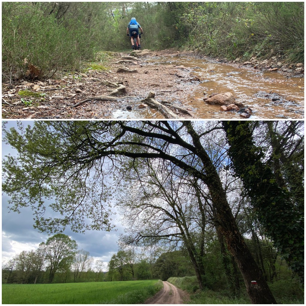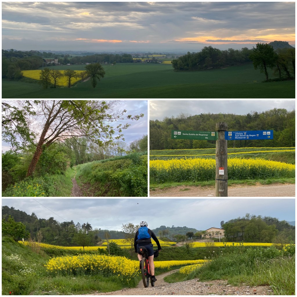 Hoy “etapa reina con final en alto” y, además, marcada por la lluvia intermitente durante toda la jornada. Pero empecemos por el principio, sabiendo lo que me esperaba he madrugado y poco después de las seis de la mañana estaba desayunando en un bar en el que ayer confirmé que abrían a esa hora. Recién amanecido me pongo en marcha mientras llueve ligeramente para encarar los primeros kilómetros después de salir de Vic en los que el camino discurre por un sendero paralelo al río Meder. Luego continúa por pistas agrícolas entre campos de colza mientras empieza a ganar altura.