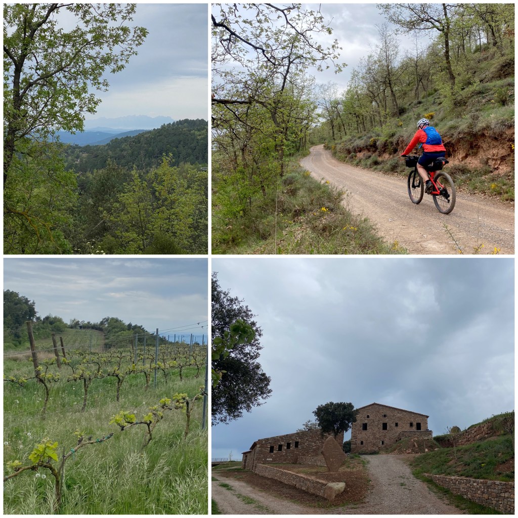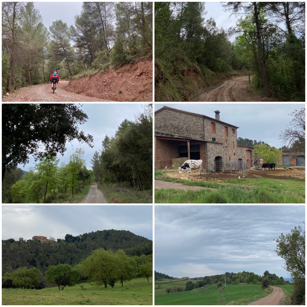Se sale de l’Estany por la parte alta del pueblo y se continúa ascendiendo durante unos quinientos metros hasta llegar al Collado de Sant Pere. A partir de ahí hay 23 kilómetros seguidos en los que no se pasa por ninguna población y que además son prácticamente todos ellos en bajada, ¡el sueño de todo bicigrino! Un descenso suave pero continuo por pistas forestales entre bosques de robles, encinas y pinos solo interrumpidos por algunas zonas de pastos ganaderos. La masía de Sant Miquel d’Oló, rodeada de viñas, pone una nota diferente en el paisaje.