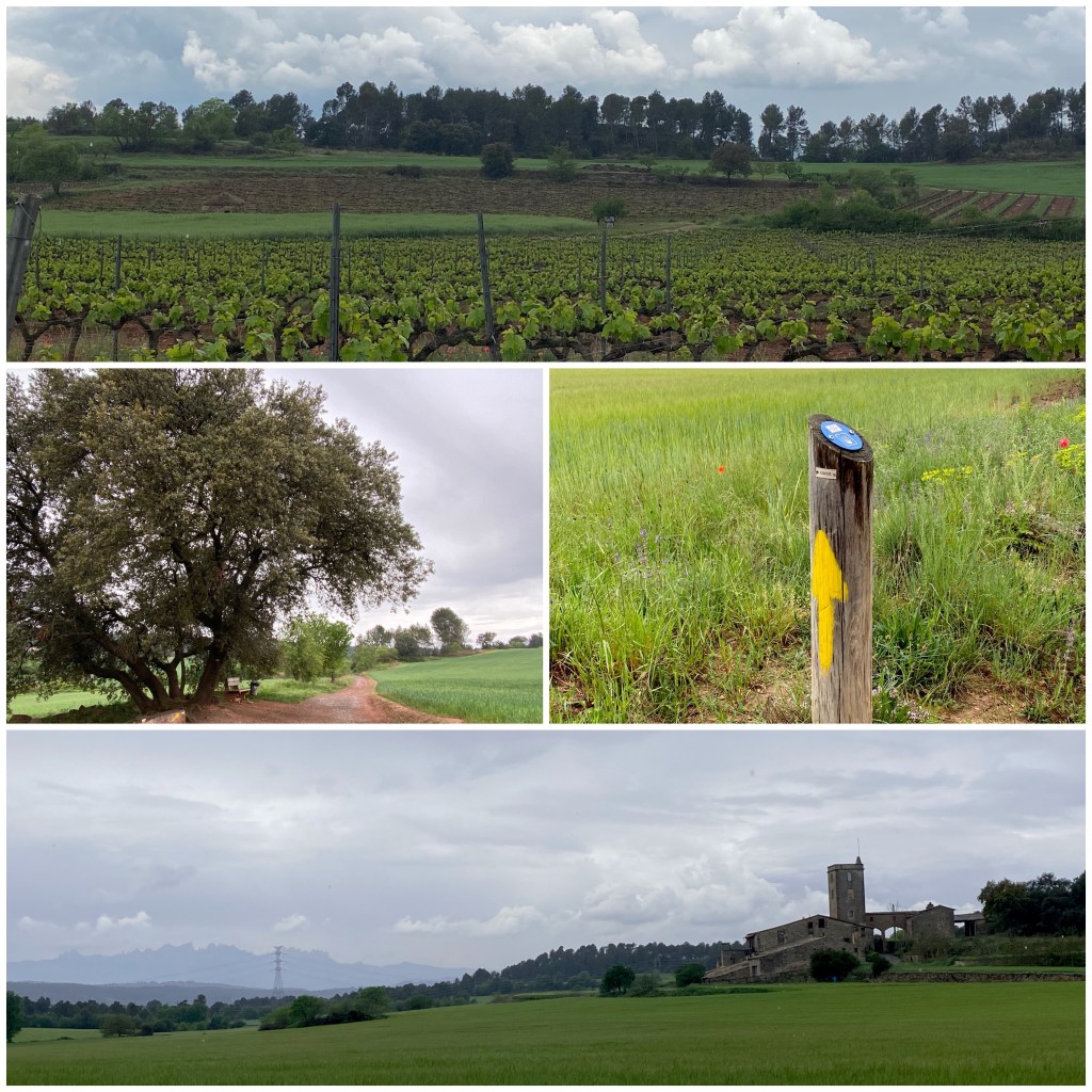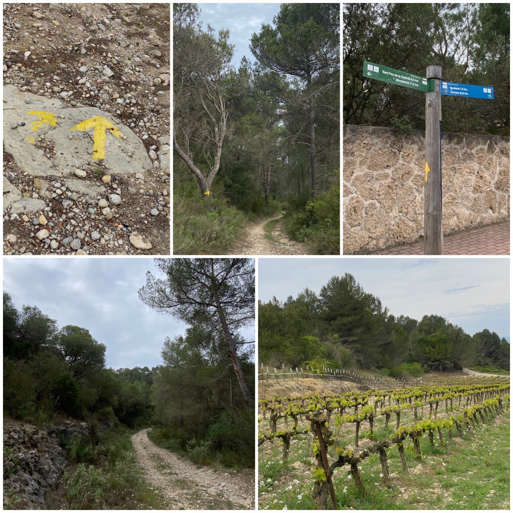 En cuanto empiezo a bajar el puerto las flechas amarillas me dirigen a un sendero que desciende entre pinares hasta que enlaza de nuevo con otra carretera por la que se cruza la autovía A2 por un puente elevado y, pasando junto a algunos viñedos, se llega a Castellolí, donde paro a desayunar.