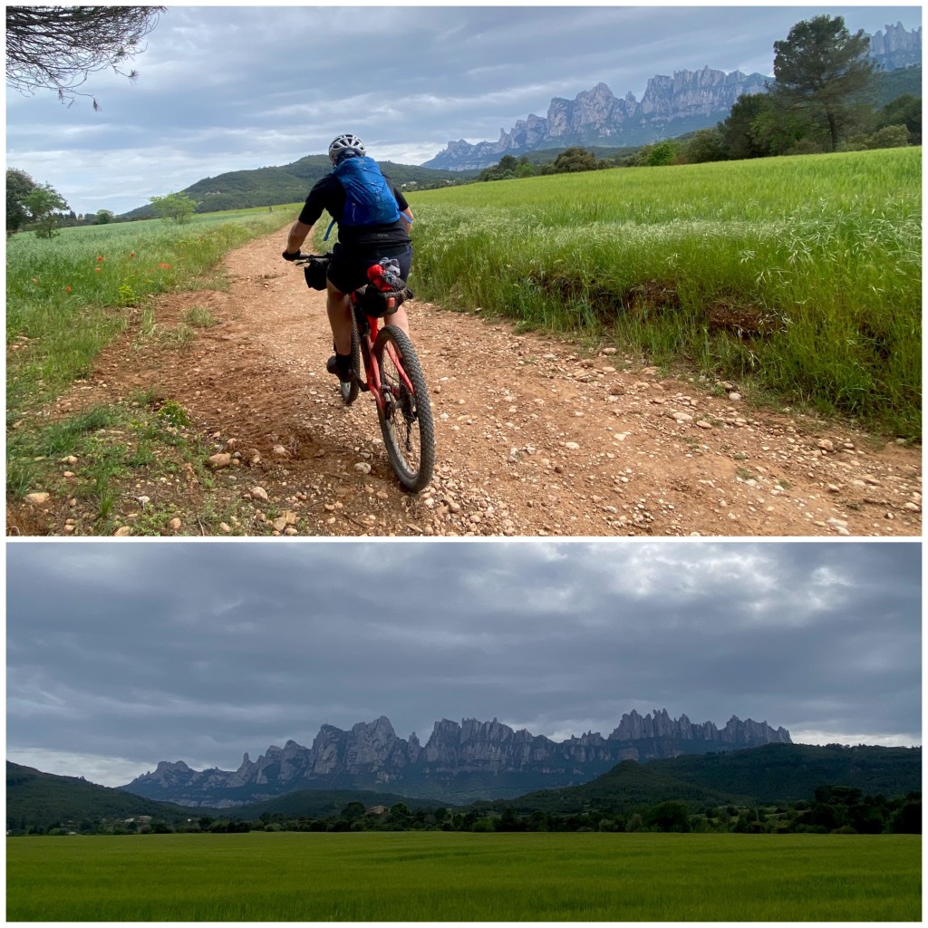 Prosigo por pistas de tierra que van acercándome a la base de la montaña. Cerca de Masganell se pasa por el Pla del Masroig, un llano sembrado de cereal que tiene unas vistas privilegiadas del macizo de Montserrat y sus característicos pináculos de roca.