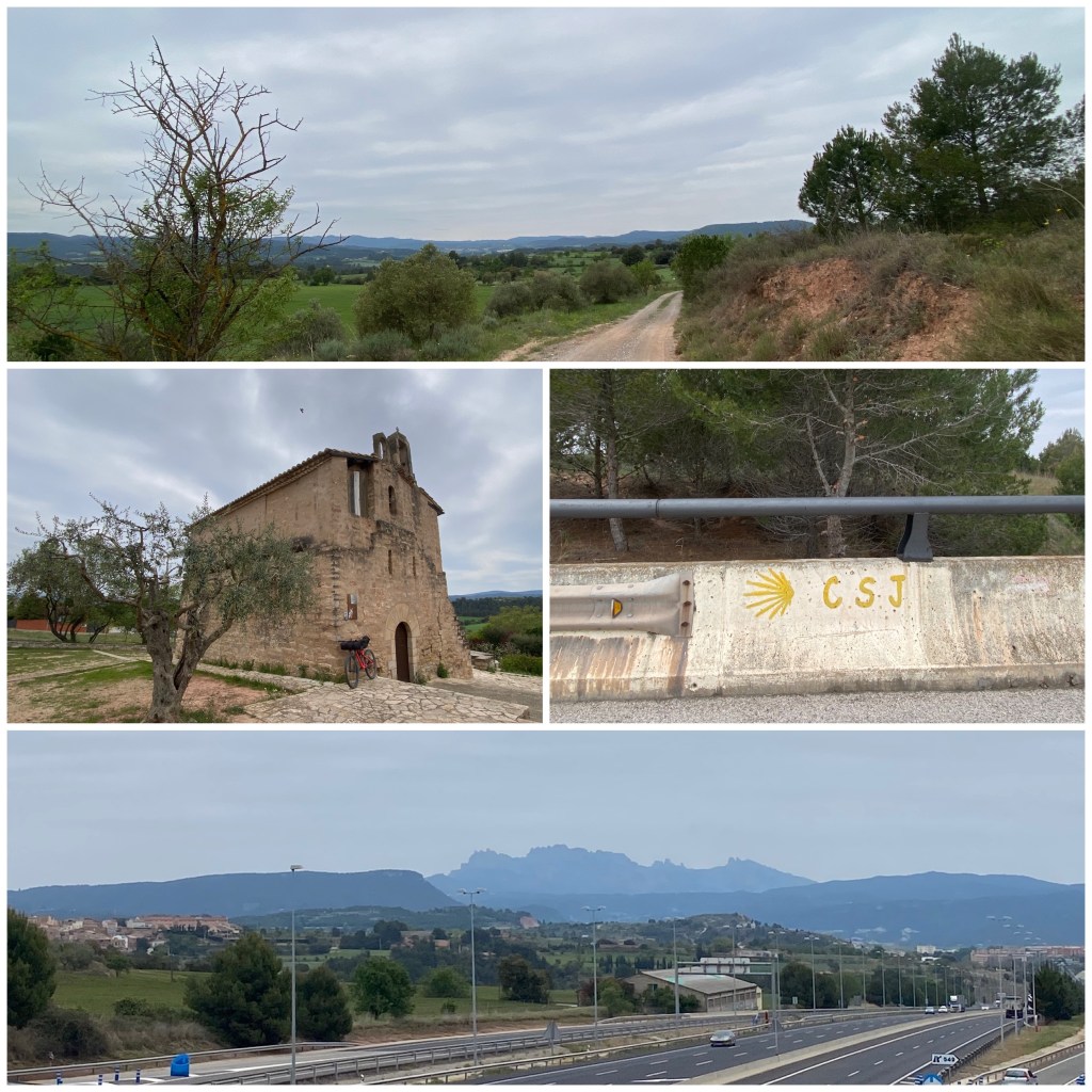 Siete kilómetros más de asfalto me dejan a las puertas de Igualada, ciudad a la que se entra atravesando una gran zona industrial. Al llegar al centro busco un taller de bicicletas para solucionar un pequeño problema mecánico y, mientras me la reparan, aprovecho para tomar un café. Una vez arreglado continúo la travesía de la ciudad hasta que ya en las afueras paso por la ermita de Sant Jaume Sesoliveres, dedicada como el nombre indica a Santiago y rodeada de algunos olivos.