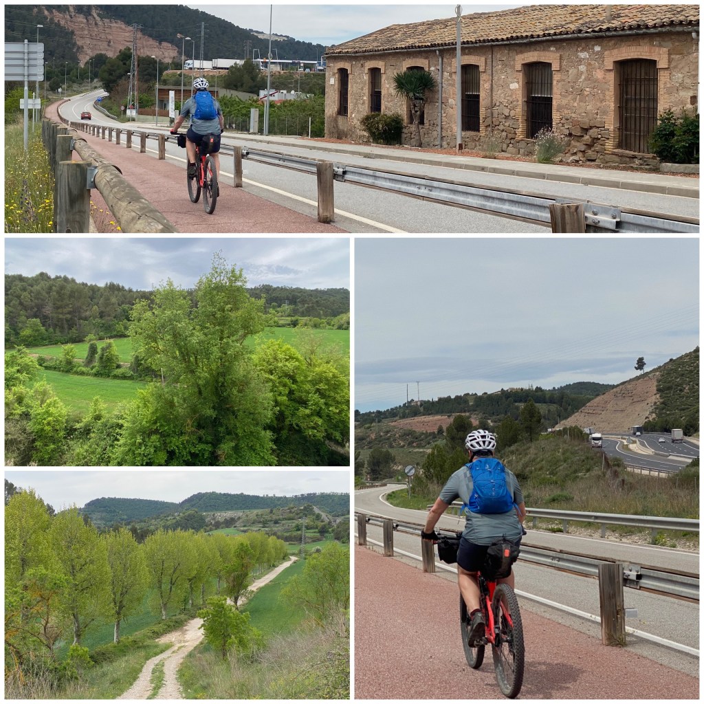 Continúo cruzando una urbanización y por diversos caminos y carreteras hasta que al atravesar por un puente de nuevo la autovía veo a mis espaldas por última vez la silueta tan característica de la montaña de Montserrat. Al otro lado de este puente empieza un carril bici que me acompañaría durante los siguientes 12 kilómetros.