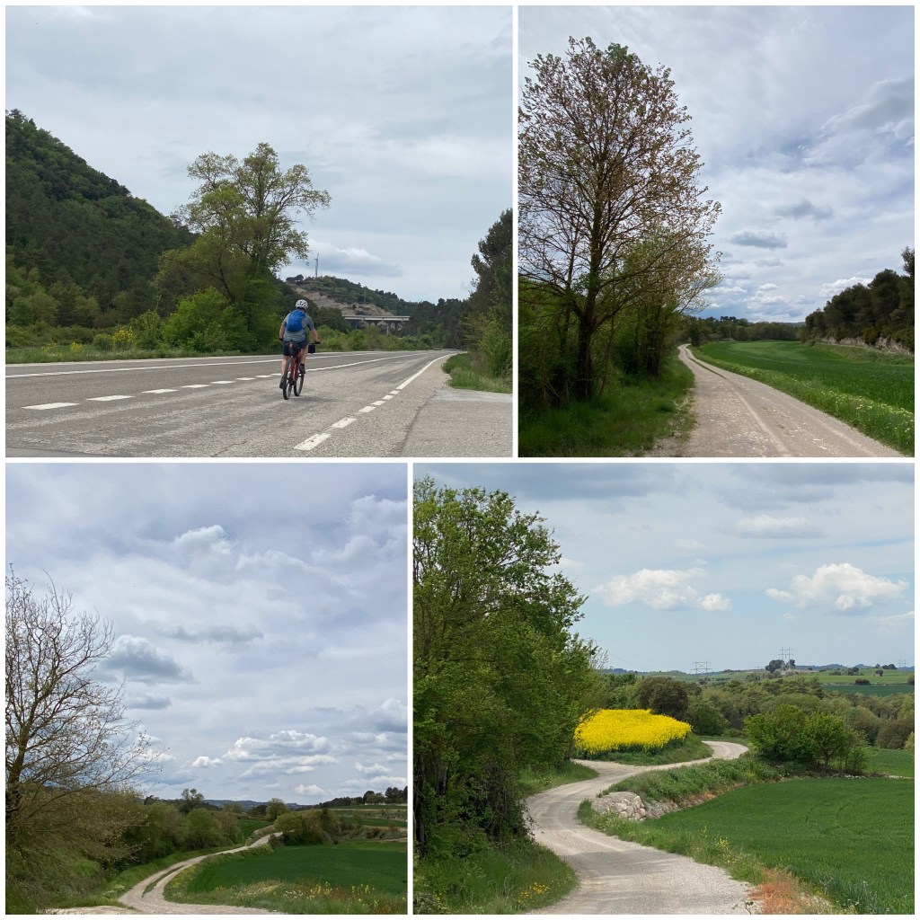 Tras una subida que esperaba más dura pero que es relativamente suave llego al puerto y empiezo el descenso que no se hace por la carretera sino por una preciosa pista que serpentea entre cultivos y bosques hasta Pallerols.