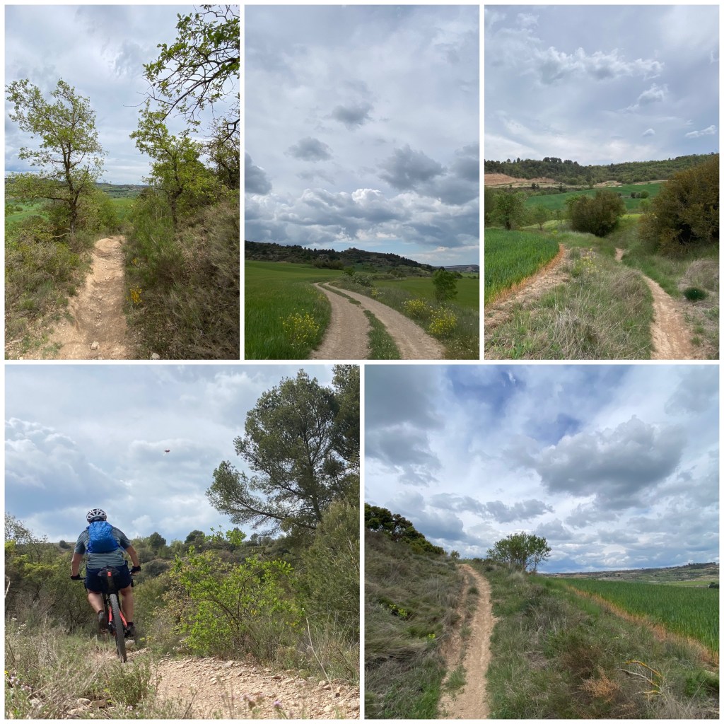 Poco antes de llegar a Cervera hay un tramo totalmente diferente al resto de la jornada. Por pistas agrícolas y senderos se recorre una zona boscosa desde la que se tiene una buena vista de los campos de cereal circundantes. En algunos momentos no es ciclable y hay que arrastrar la bici pero vale mucho la pena para variar de tanto asfalto.