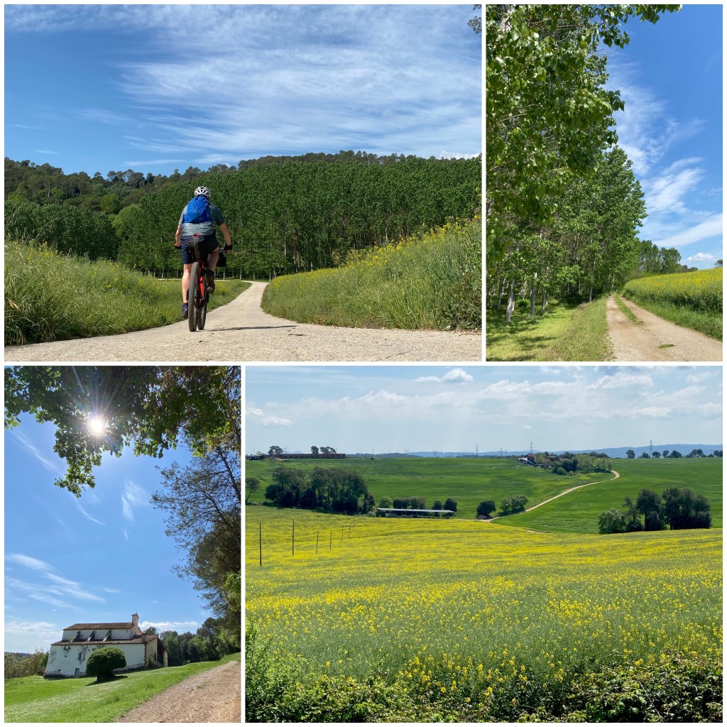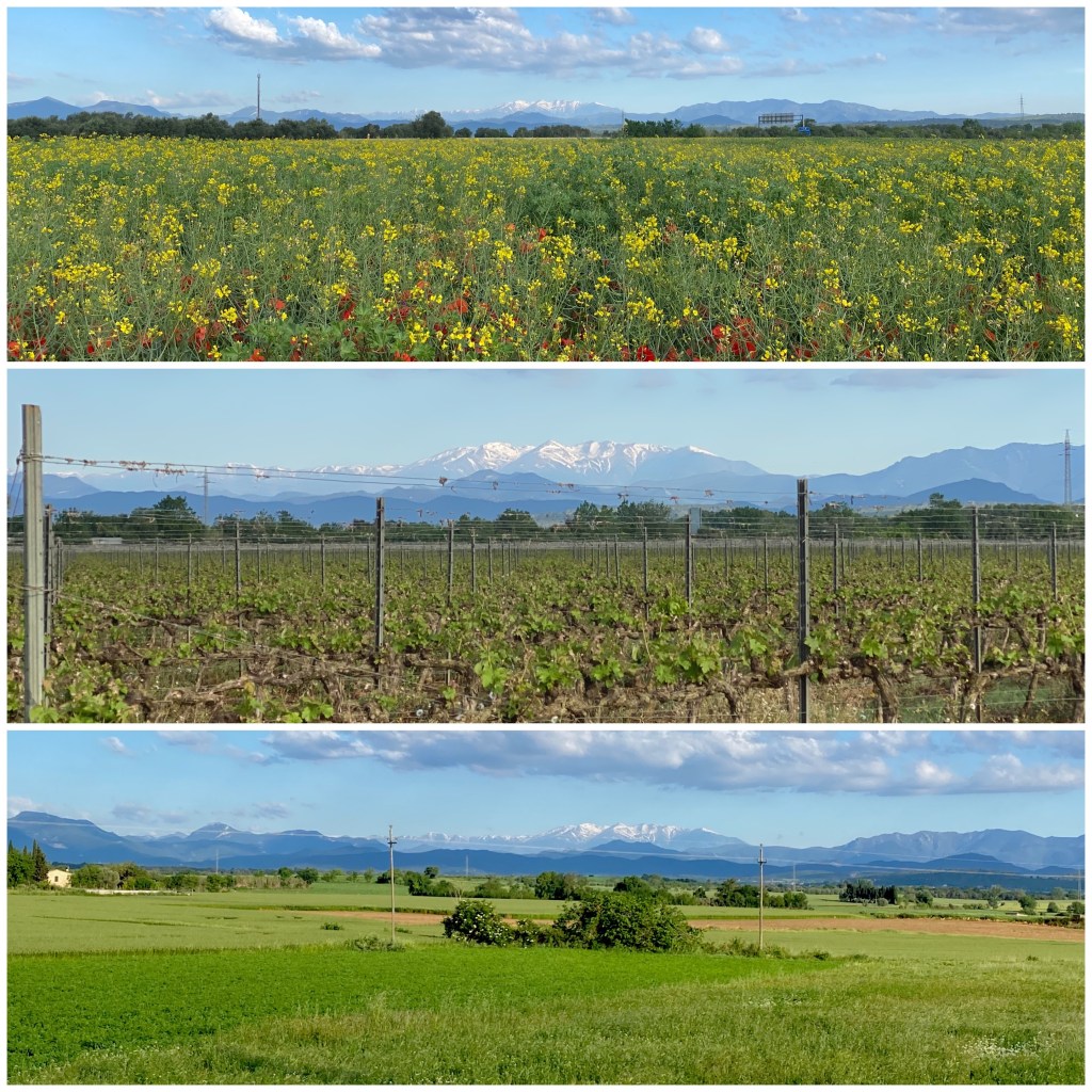 Tras abandonar el casco urbano de Figueres los primeros kilómetros del día voy atravesando zonas agrícolas combinando pistas de tierra y tramos de asfalto. Paso viñedos, plantaciones de colza con su característica flor amarilla y otras de algún cereal, probablemente maíz. Como magnífico telón de fondo tengo los Pirineos con las últimas nieves de la temporada.
