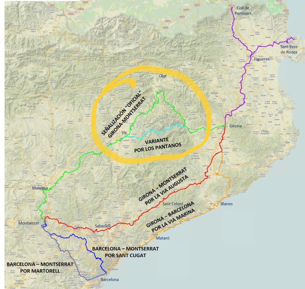 Aquí el Camí de Sant Jaume ofrece dos alternativas. El más “oficial”, señalizado por la Generalitat, continúa por la vía verde hasta Sant Esteve d’en Bas y luego, siguiendo el Camí Ral, remonta el altiplano del Collsacabra y lo atraviesa para posteriormente descender a la ciudad de Vic. Es el recorrido que hice a pie hace un año. La alternativa, marcada hace unos años por alguna de las asociaciones catalanas de amigos del Camino, se dirige a Vic siguiendo el curso del río Ter por la zona de los pantanos de Sau y Susqueda y, como se aprecia en este mapa, es algo más lógica y directa, evitando dar un rodeo. Yo, esta vez, tomaré esta variante.