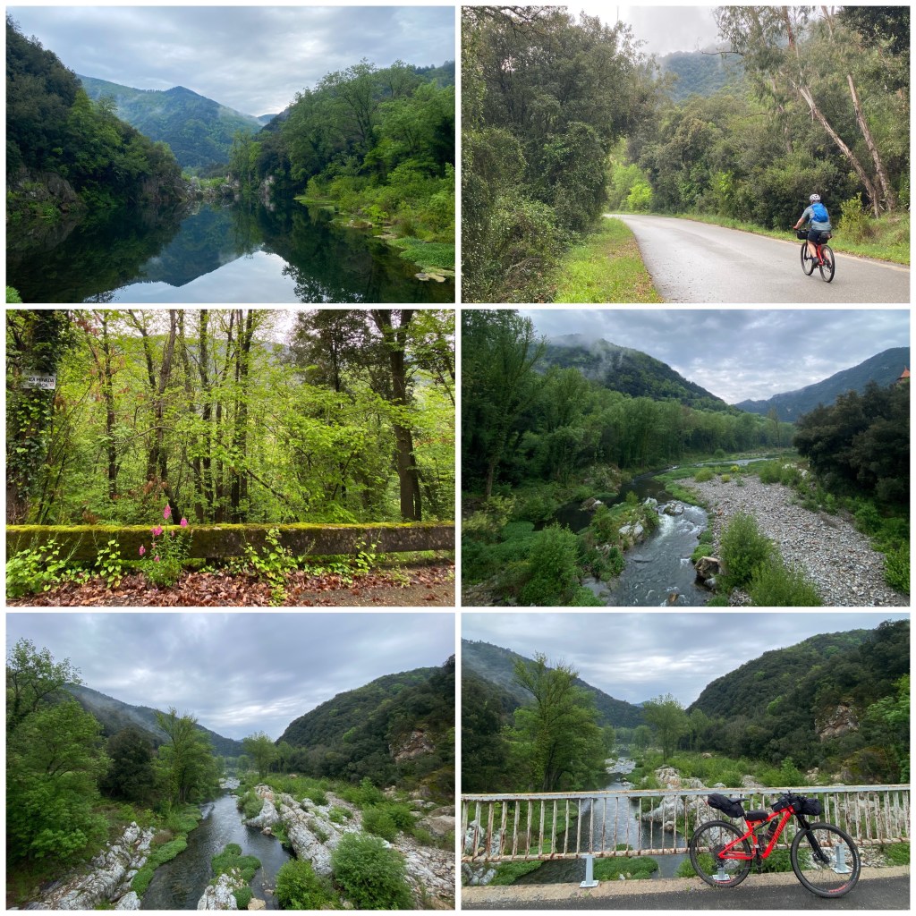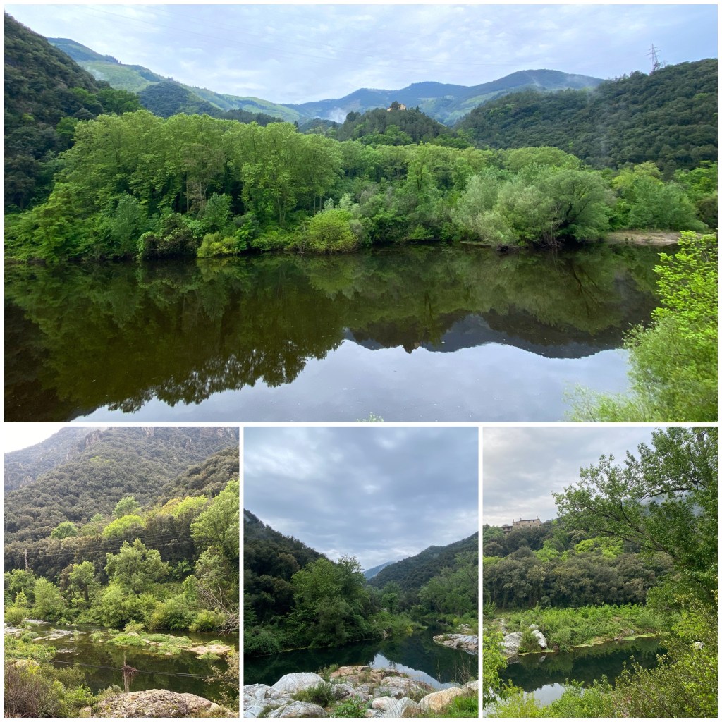 Esta vía verde sigue el recorrido del antiguo ferrocarril de vía estrecha que unía Olot con Girona y que funcionó entre 1911 y 1969. Por ella recorro los últimos 20 kilómetros del día avanzando siempre en paralelo al río Ter, aunque no siempre está a la vista porque la vegetación hace de barrera visual. A última hora han caído algunas gotas pero ha parado enseguida y no ha llegado a llover. Pendiente del cielo llego a Anglès donde finalizo la etapa.