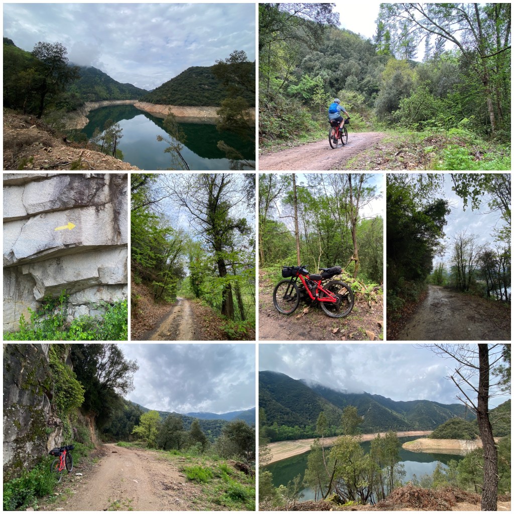 Prosigo rodeando el embalse de Susqueda por carretera hasta que a unos dos kilómetros de la presa se acaba el asfalto y se convierte en una pista de tierra en la que, con las lluvias de los últimos días, hay tramos con muchísimo barro. El cielo sigue pareciendo dispuesto a descargar en cualquier momento pero sorprendentemente ha aguantado bastantes horas sin llover.