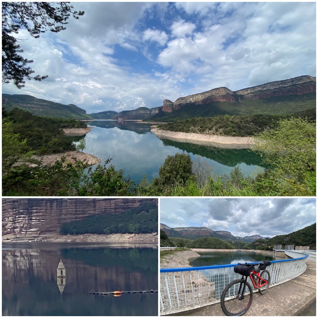Y una vez al otro lado del río se continúa por la carretera asfaltada de acceso al embalse desde la que se puede ver como sobresale del agua el campanario de la iglesia de Sant Romà de Sau, el pueblo que fue inundado cuando se construyó el pantano en los años 60 del siglo pasado. Que el campanario sea visible es señal de que el nivel del agua está bajo, de hecho leo después que Sau estaba hoy al 60% de su capacidad, y en épocas de sequía extrema puede llegar a emerger la iglesia entera.
