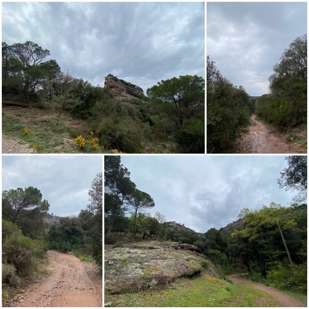 Y es que la llanura conocida como la Plana de Vic limita al oeste con las sierras del Moianès que hay que cruzar. Por ello poco a poco van desapareciendo los cultivos del llano y se empieza a remontar por una pista forestal. Son unos seis kilómetros de subida entre bosques compactos interrumpidos ocasionalmente por algún prado con pastos y alguna masía aislada.