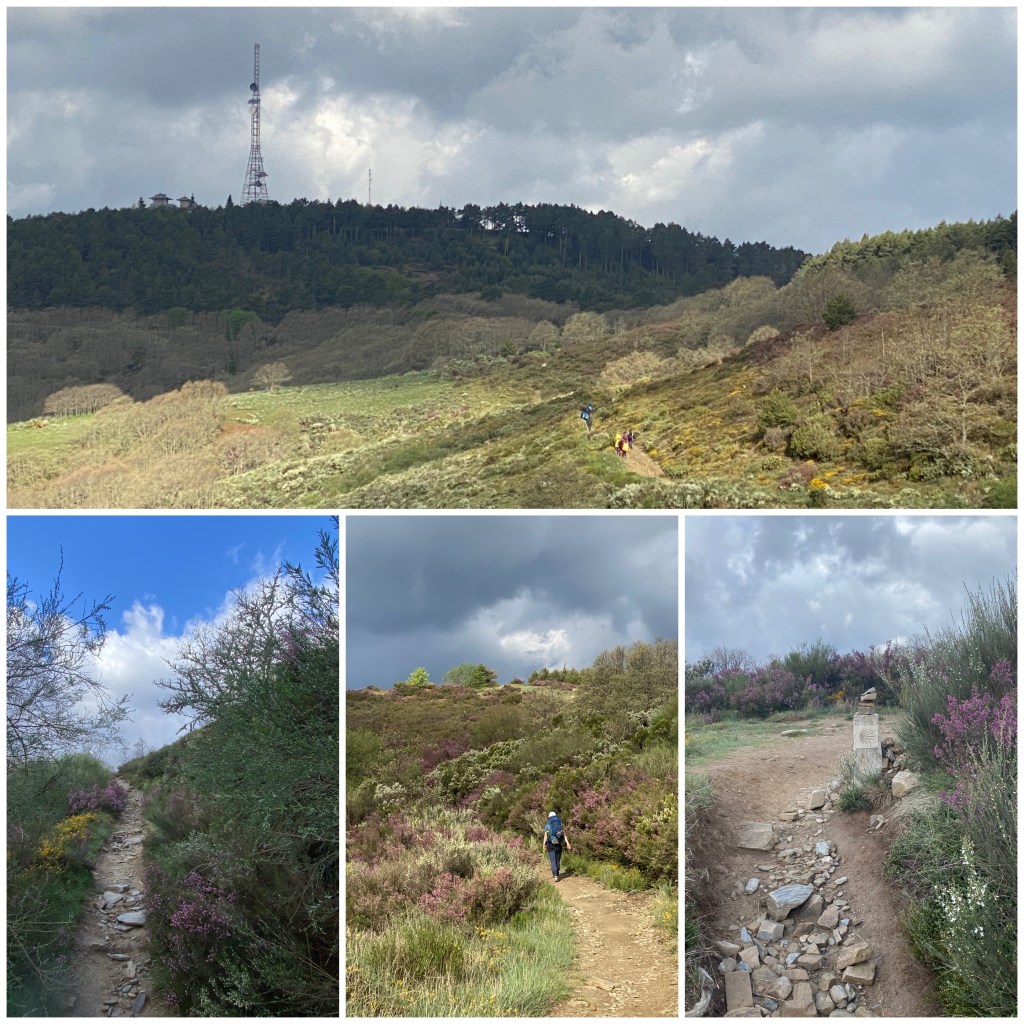 A partir de aquí el itinerario sigue bajando y subiendo constantemente por bonitos caminos entre bosques. A unos tres kilómetros se sube un segundo alto, el de San Roque, en el que hay una enorme estatua de un peregrino andando contra el viento. Unos kilómetros después y tras una dura rampa final se llega a un tercer alto, el del Poio, en el que hay un par de bares y donde paro a comer un pincho de tortilla mientras las gallinas picotean a mi alrededor.