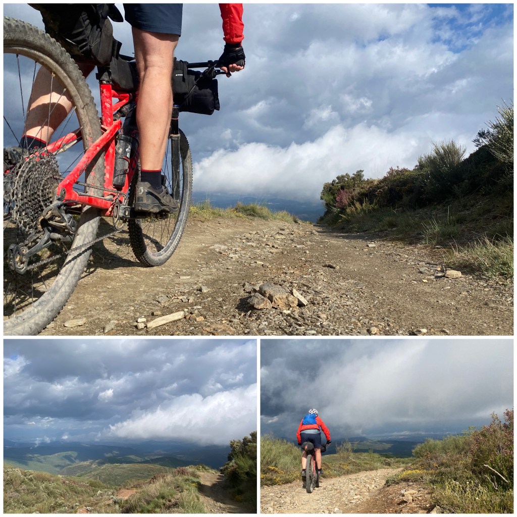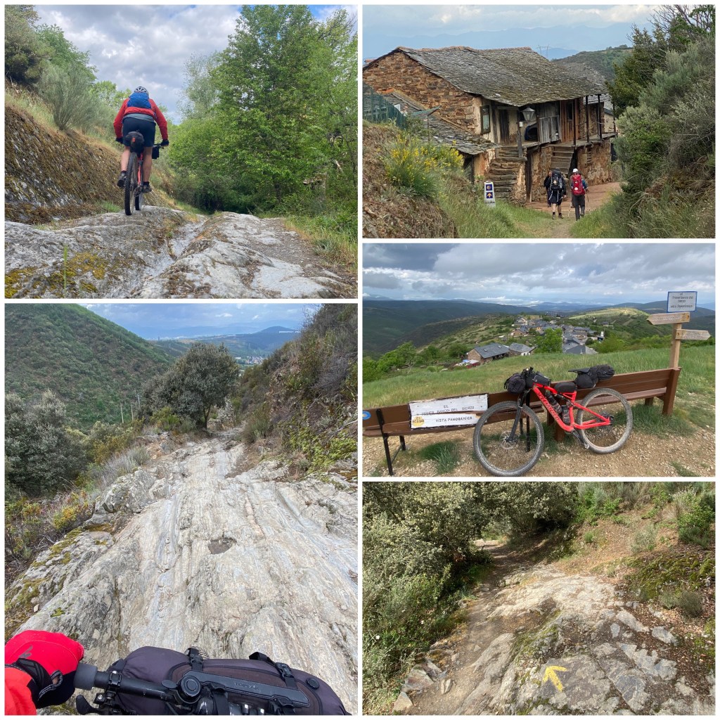 Los siguientes diez kilómetros son un larguísimo descenso por senderos, en ocasiones con muchísima piedra suelta. Algunos tramos son verdaderamente empinados y a pie debe ser rompedor para las rodillas. De hecho, tanto a pie como en bicicleta este descenso es el plato fuerte del día, mucho más exigente que la subida a la Cruz de Ferro o al alto de las Antenas.