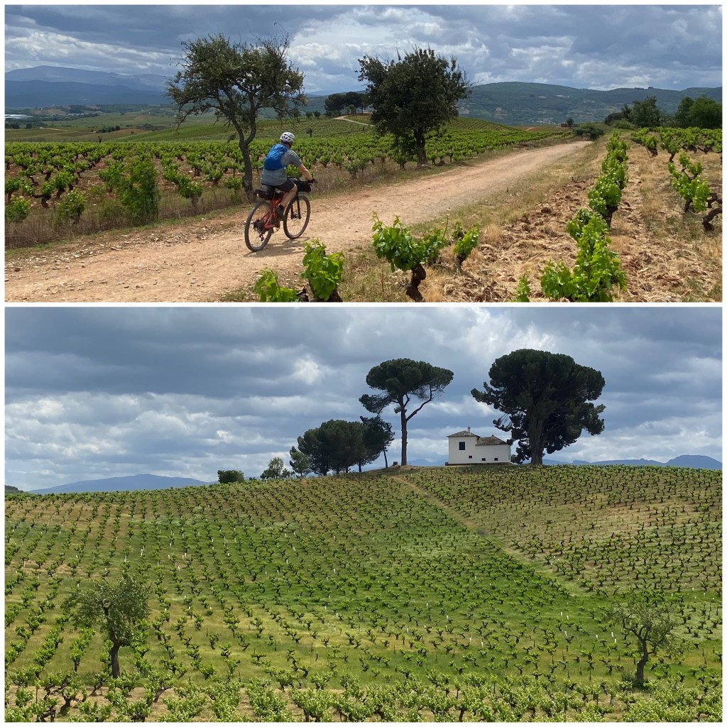 Pero hoy prosigo por el Francés y para ello salgo de Ponferrada dirección Villafranca del Bierzo. Los primeros quince kilómetros, hasta Cacabelos, son algo anodinos. Por pistas y tramos de carretera voy recorriendo la parte más llana de la comarca del Bierzo sin nada que destaque demasiado. En Cacabelos paro a comer un bocadillo y después el paisaje mejora enormemente mientras serpenteo entre un mar de viñedos.