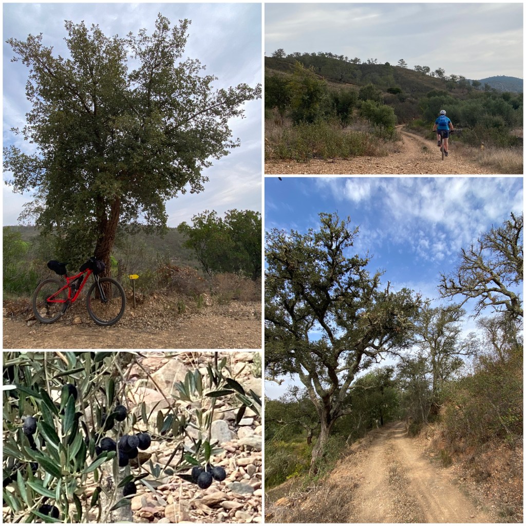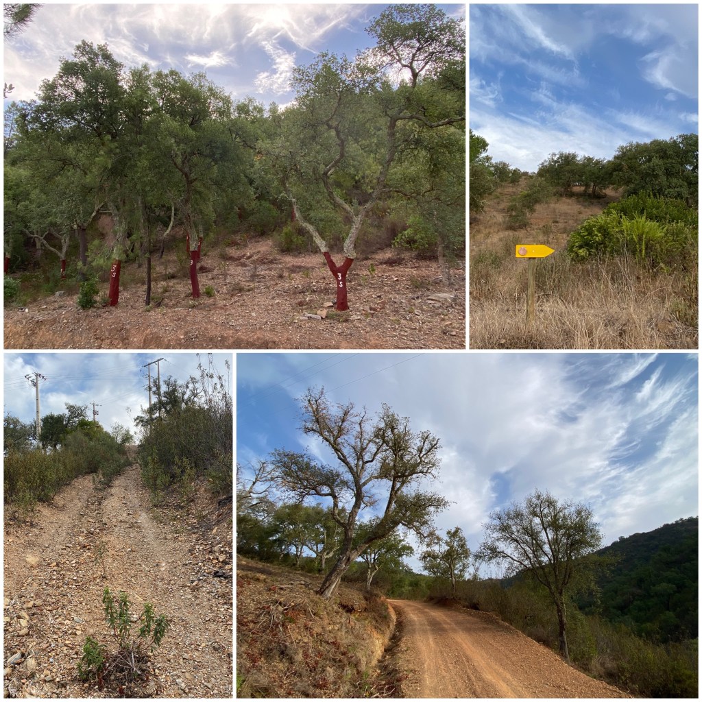 La ruta continúa por kilómetros y kilómetros de pistas forestales que serpentean por los montes subiendo y bajando. El paisaje es muy bonito, con predominio de alcornoques para la extracción de corcho combinados de vez en cuando con algún olivo y, muy esporádicamente, con algunas especies foráneas como pinos y eucaliptos.