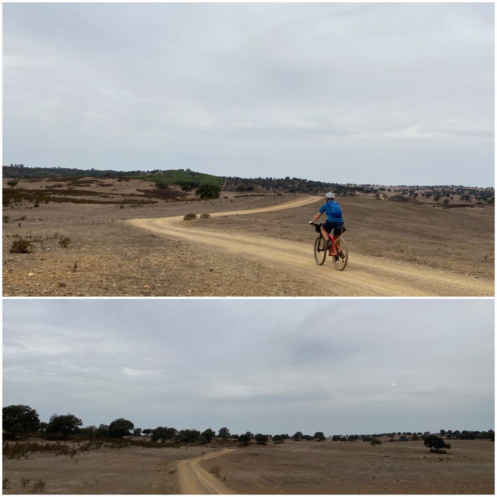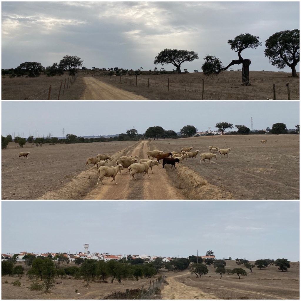 Afortunadamente, a partir de aquí el terreno se transforma radicalmente. La sierra ha quedado atrás y el paisaje del Baixo Alentejo lo forman grandes extensiones de pastos con árboles aislados, mayoritariamente encinas y alcornoques. No llega a ser una llanura, pero es un relieve suave y ondulado.