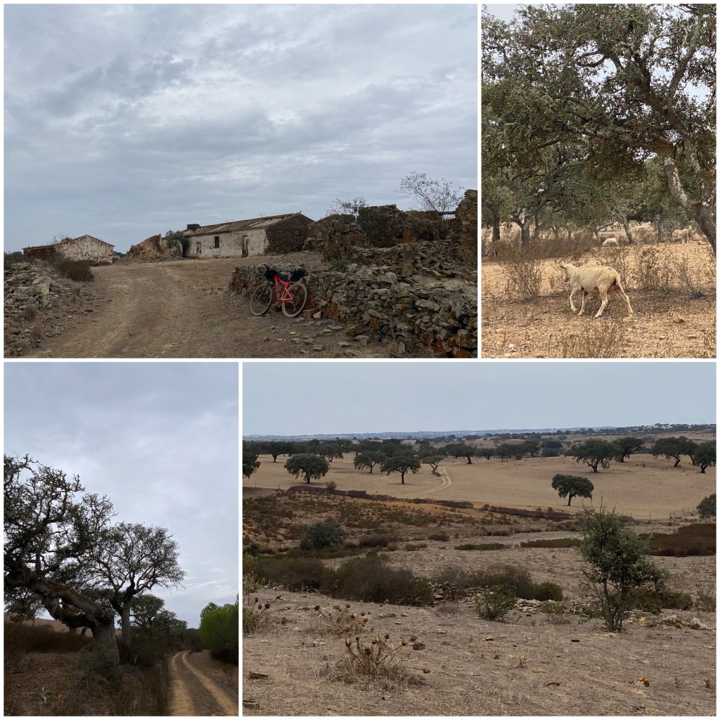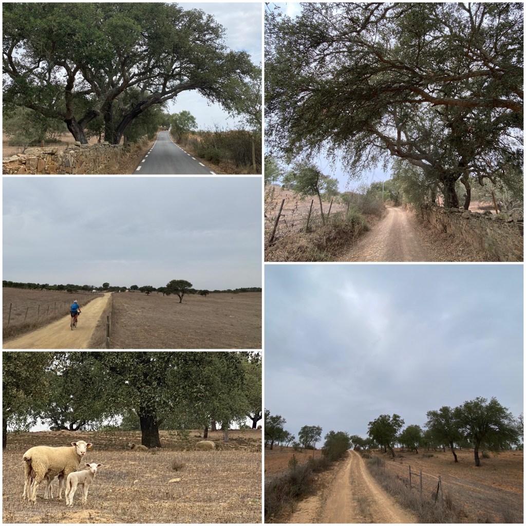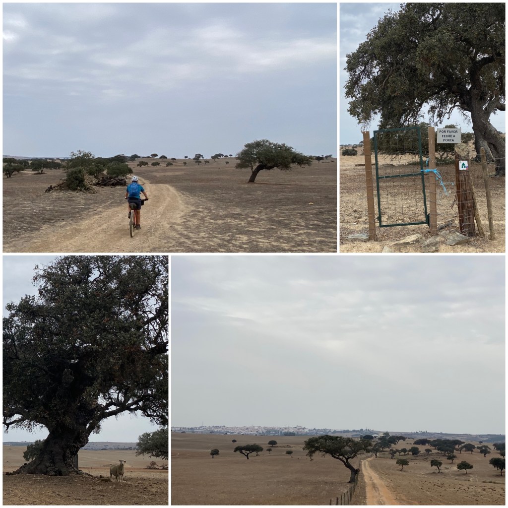 Así llego a Almodôvar, donde paro a comer. Tras la pausa sigo un par de kilómetros por asfalto y luego, ya por pistas de tierra polvorientas, continúo cruzando las mismas grandes fincas, con encinas y alcornoques solitarios, grandes extensiones de pastos y algunas ovejas. En multitud de ocasiones hay que abrir, cruzar y volver a cerrar portillas para el ganado.