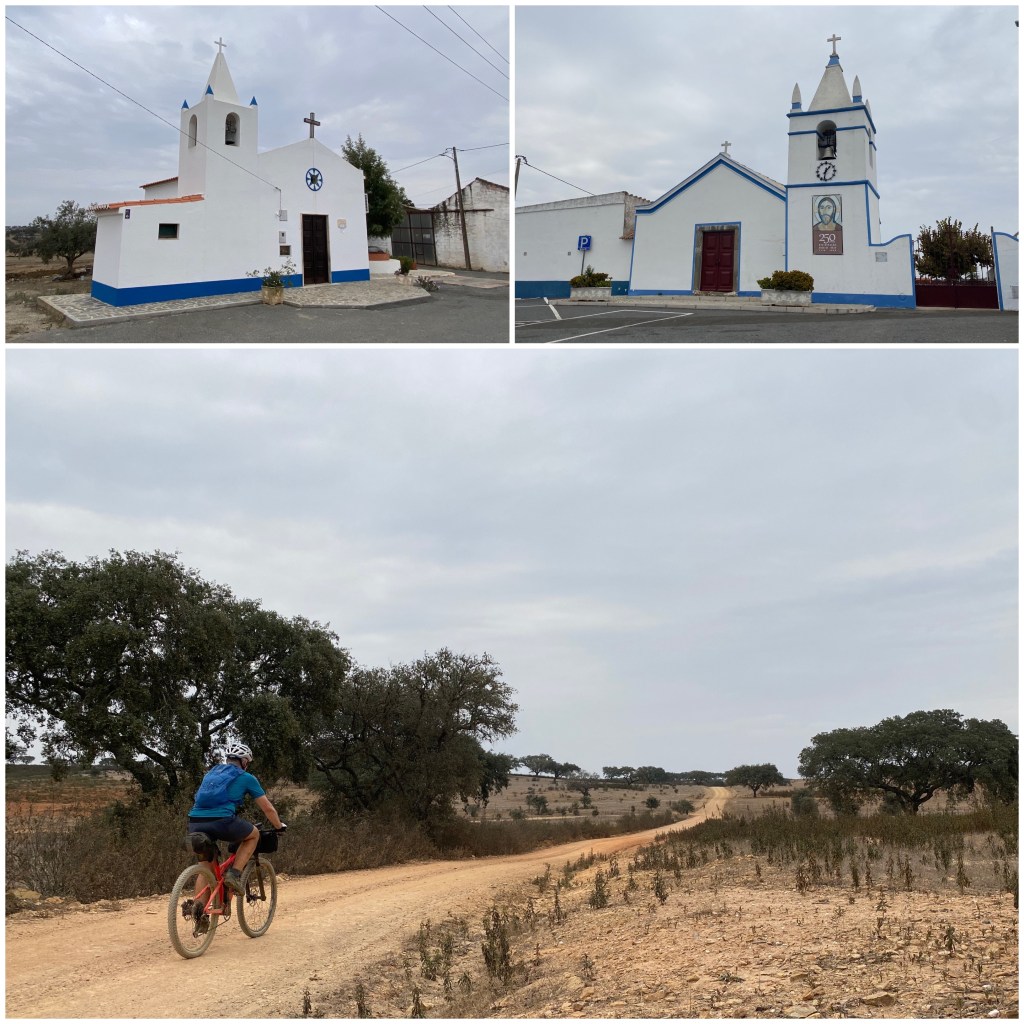 Santa Cruz, primera población del Alentejo a la que llego, debe su nombre a la antigua iglesia de la Santa Cruz, construida en el siglo XVI y vinculada desde su origen a la Orden de Santiago, como se reconoce por la característica cruz labrada en la fachada sobre la puerta principal. Una vez en el pueblo paro un rato en una placita a comerme un plátano y descansar un poco. Llevaba hechos unos 40 kilómetros, menos de la mitad de la etapa que había previsto, pero la travesía de la Serra do Caldeirão había supuesto cerca de 1.000 metros de desnivel positivo.