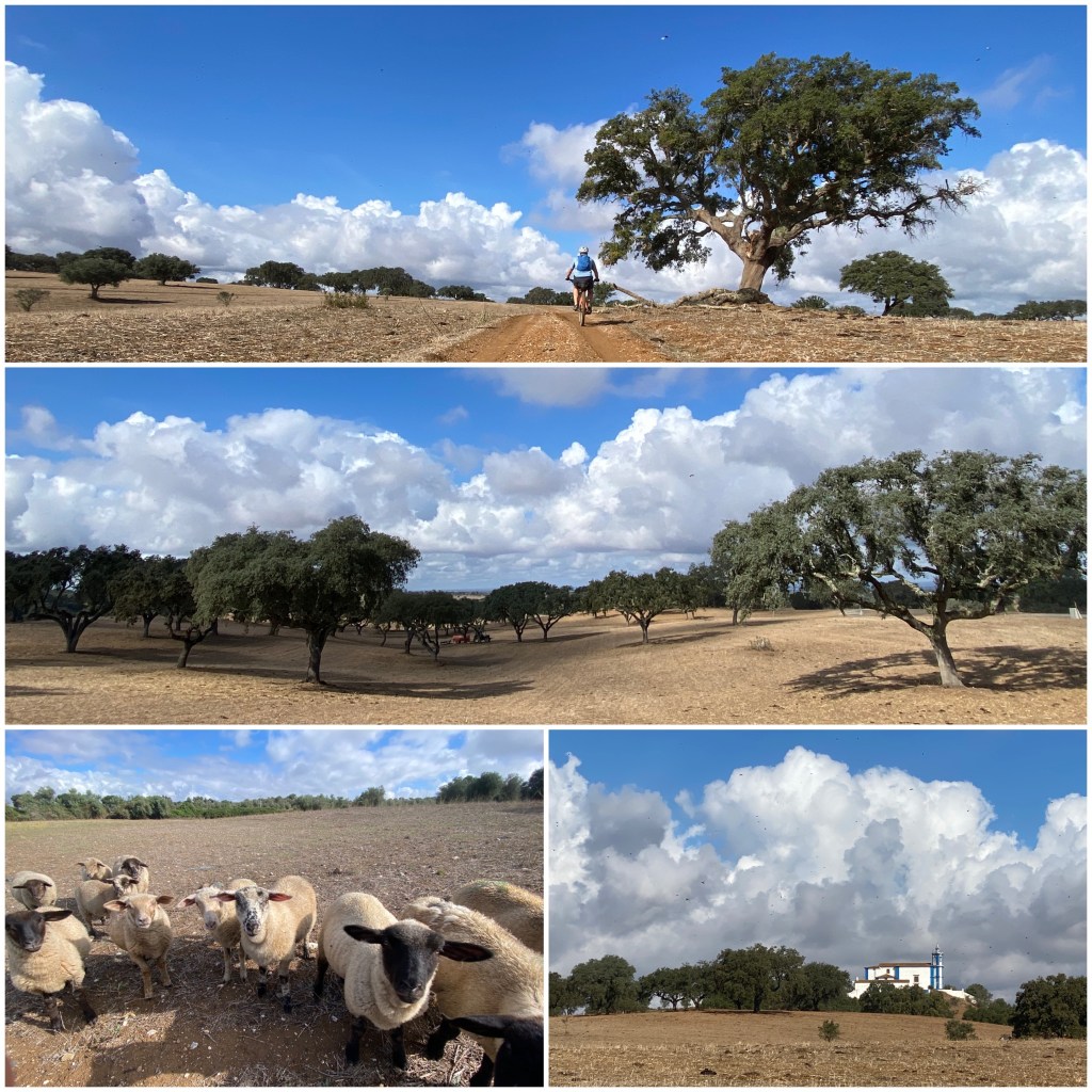 Poco después de salir de Messejana cruzo una finca preciosa con el pasto recién segado y unas encinas magníficas, pero en la que a mi paso se levantan miles de hormigas voladoras gigantes. Hay que circular con la boca cerrada y con mucho cuidado para no tragarse ninguna….