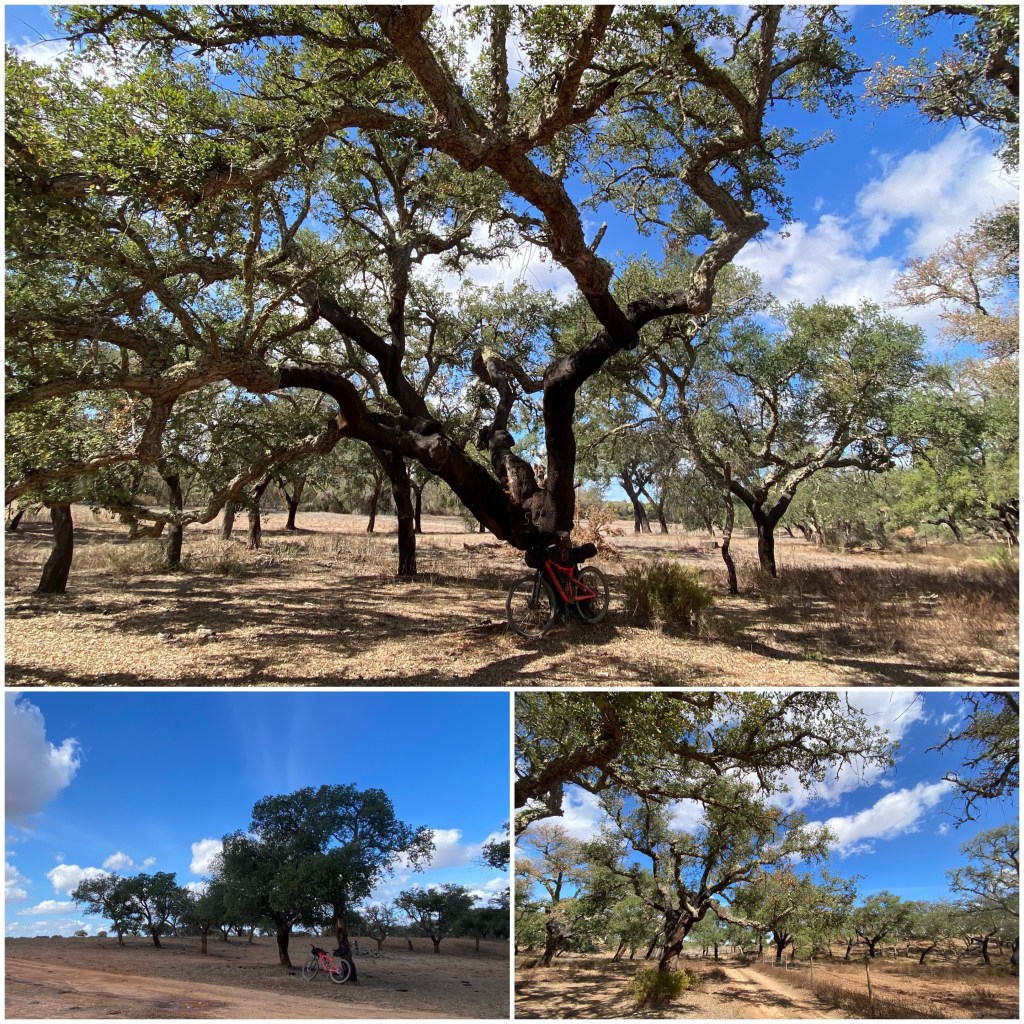 En el siguiente pueblo al que llego, Fornalhas Velhas, paro a desayunar. A la salida se atraviesa la finca Monte Novo das Fornalhas, con un alcornocal espectacular. Creo que he de retirar la frase anterior donde decía que el paisaje era monótono…