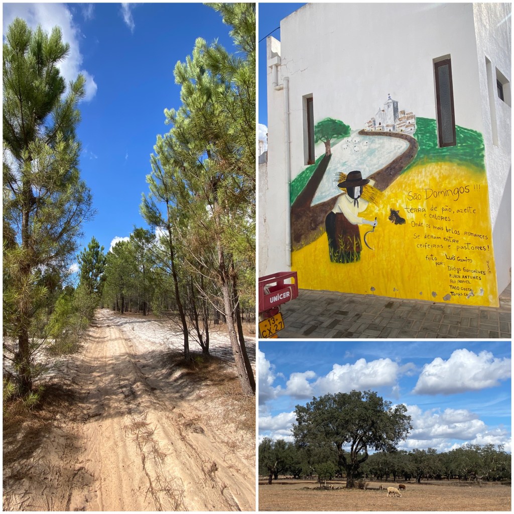 Sigo por fincas con pastos, encinas y alcornoques hasta que hay un nuevo cambio de paisaje al atravesar un pinar en el que el terreno arenoso dificulta un poco el avance. Luego llego a São Domingos, “tierra de pan, aceite y calores”, según reza en un mural callejero, y donde aprovecho para comerme un bocadillo.