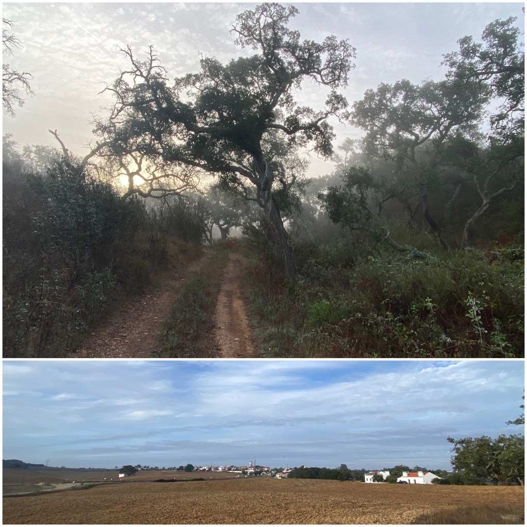 Un par de fuertes repechos a la salida de Santiago do Cacém y ya estoy en el monte, donde, como ayer, empiezo el día envuelto en la niebla. Ya en los primeros kilómetros el camino atraviesa un bosque espectacular, precioso. Sigo así durante diez kilómetros hasta que llego a una pequeña aldea.