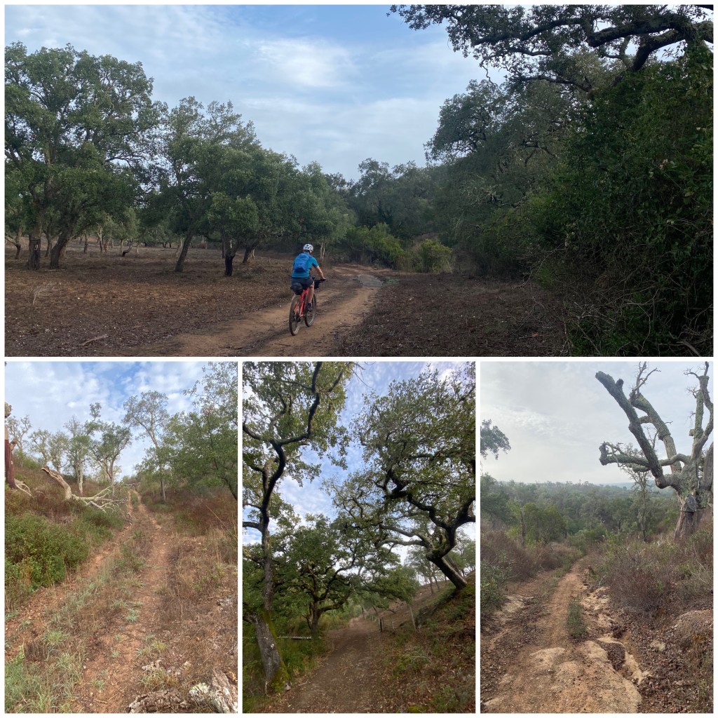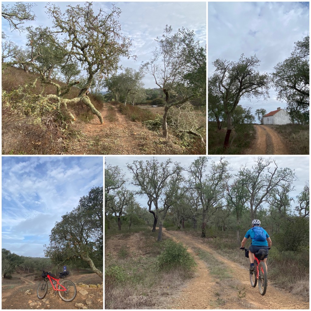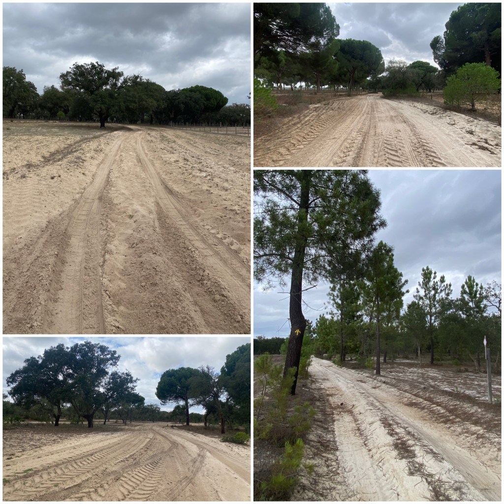 Cuando acaban los pinos paso una granja de vacas y empiezo a cruzar un alcornocal. Nada más internarme en él, la pista es tan arenosa que no se puede circular y he de arrastrar la bicicleta. Luego mejora pero enseguida vuelve la arena. Al final, lo que ha empezado siendo una anécdota, un pequeño tramo de arena, se ha convertido en una pesadilla y he tardado más de una hora para hacer tres o cuatro kilómetros. Era como circular por una playa y tenía que caminar casi todo el tiempo.