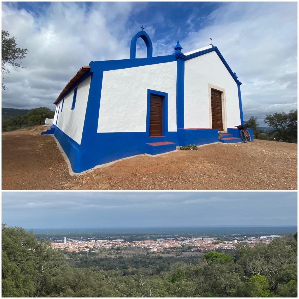 Siempre a través del bosque, llego en lo alto de una colina a la Ermida da Nossa Senhora da Penha de França, un santuario desde el que ya se divisa a mis pies la población a la que me dirijo, Grândola, y desde donde también me llama la atención que los montes se acaban y lo que viene a continuación es una enorme llanura. Desciendo de la Ermita rápidamente por un sendero y, tras atravesar un gran olivar medio abandonado, entro en la población.