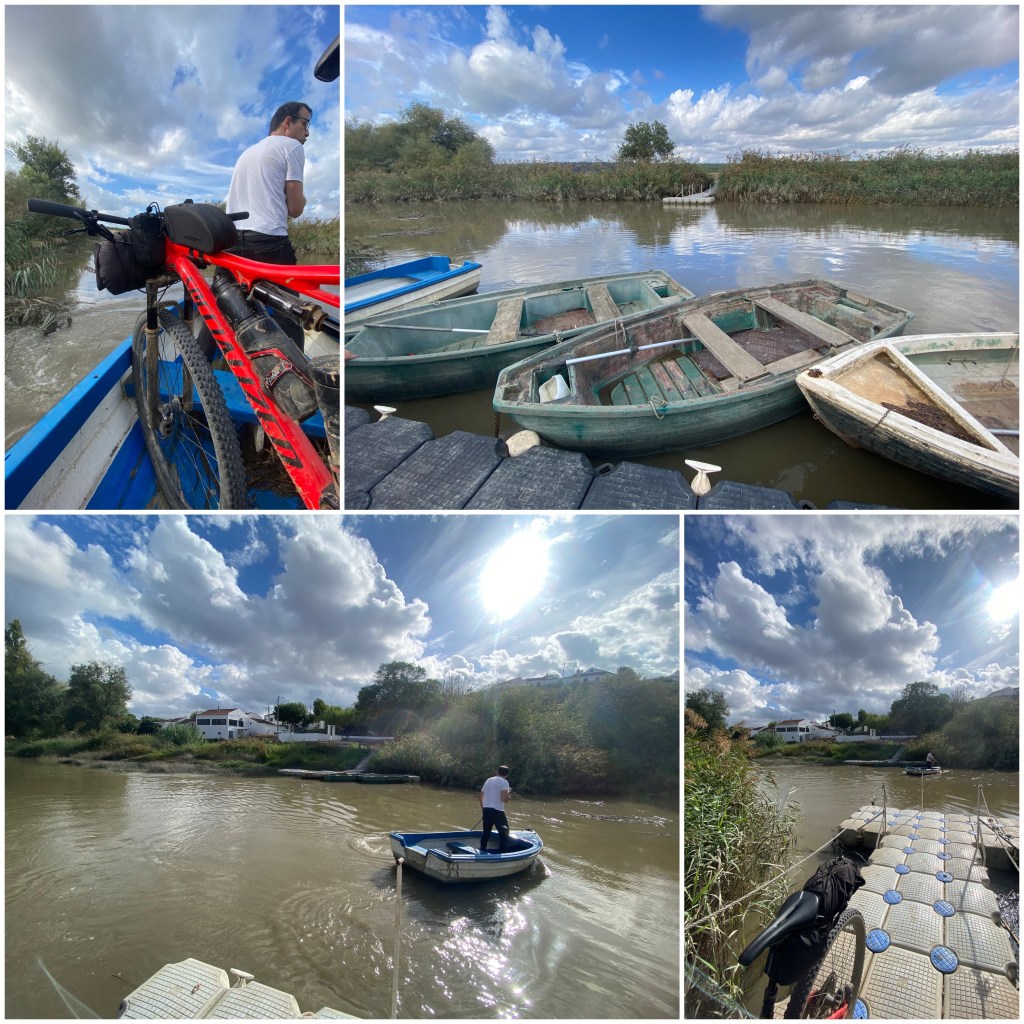 Este tramo termina en Vale do Guiso, una pequeña aldea junto al río Sado. Aquí hay que acercarse al café O Baracinha, justo en la orilla, porque ellos tienen una barca con la que cruzan a los peregrinos al otro lado del río. Está previsto así en el diseño de la etapa del Camino de Santiago. Pues bien, llego al lugar, pregunto amablemente, y me dan a entender que con bici no se puede pasar, que la barquita es muy inestable y se puede volcar, y que, además, por el otro lado no se puede circular con bici, que hay que empujarla… Mucho mejor, me explican, ir por carretera hasta Alcácer do Sal, llegaré antes… Todo eso en portugués y entendiendo la mitad. En fin, decido parar, comerme un bocadillo y pensar mejor las opciones. Lo de volcar la barca, pase, pero lo de poder o no circular por el otro lado me tenía mosca después de lo que me habían costado los últimos kilómetros. Al otro lado de río quedaban unos 12 hasta Alcácer do Sal, si todos, o parte de ellos, eran arenosos, podía pasarme horas…
