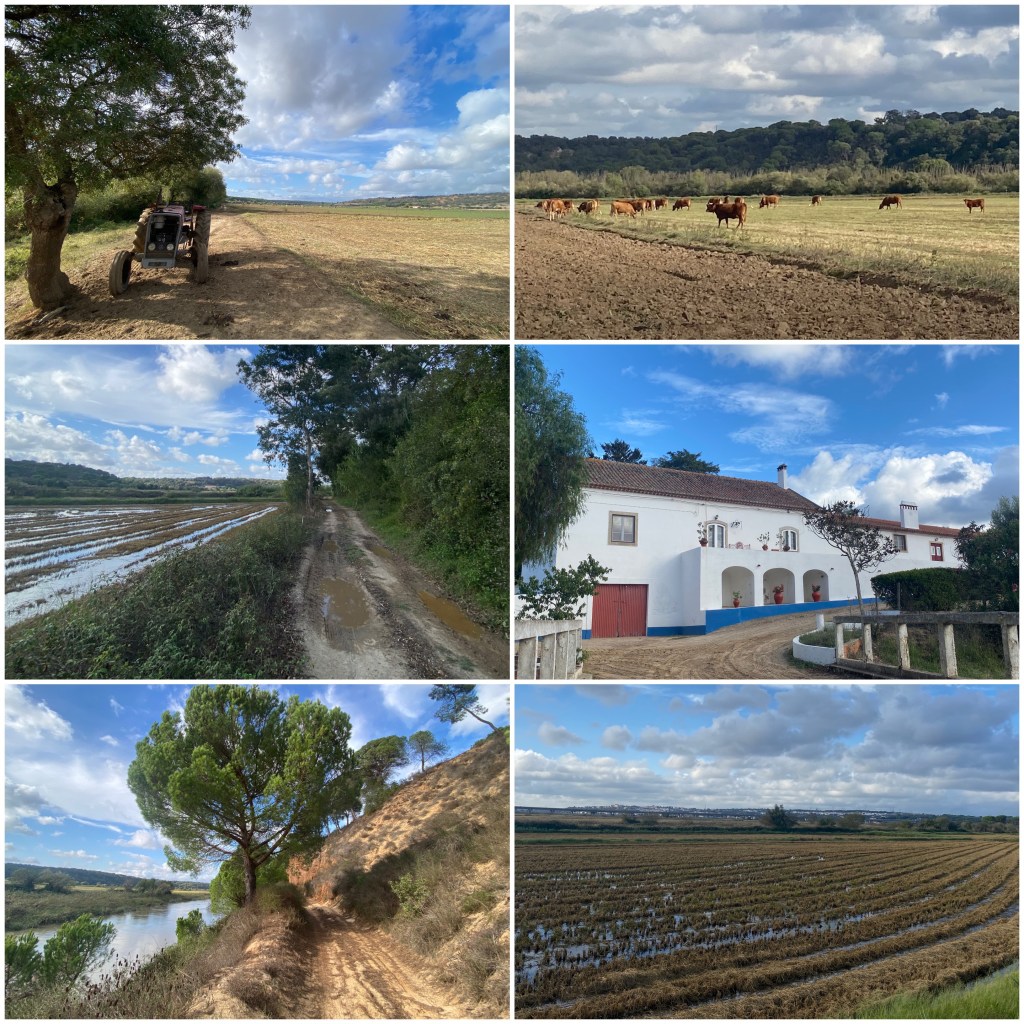 En la otra orilla del Sado, aprovechando los meandros del río, hay unas grandes llanuras en las que pastan rebaños de vacas. Más adelante también veo arrozales inundados. Y para atravesarlos circulo por un camino con algún tramo de arena pero cuyo problema principal no es ese, sino el barro. Aún así se puede avanzar bien, y rápidamente voy recorriendo los kilómetros que me quedan hasta Alcácer do Sal.
