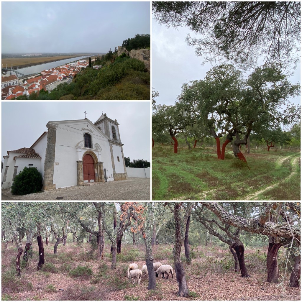 Hoy toca una etapa bastante corta que casi puede considerarse una jornada de “descanso activo”. Para afrontarla, empiezo remontando por las calles de Alcácer do Sal hasta la parte alta, donde están los restos de su castillo y la iglesia de Santa Maria do Castelo. A partir de aquí se abandona la ciudad, primero durante cuatro kilómetros por la carretera N5, con mucho tráfico y atravesando polígonos industriales, y luego ya por una pista que avanza entre grandes plantaciones de pinos y alcornoques.