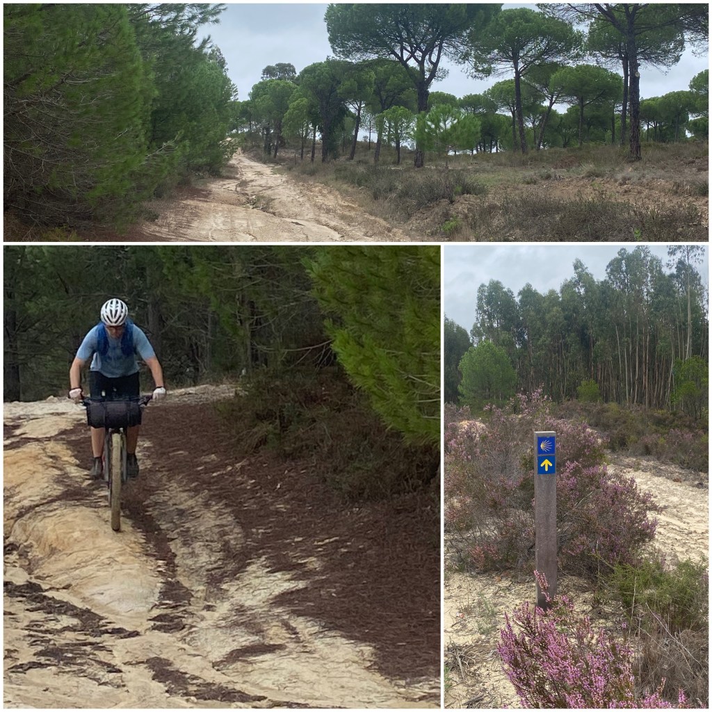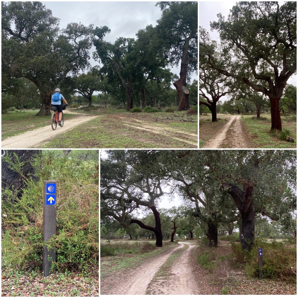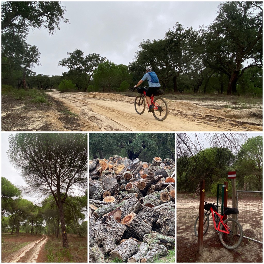 Los siguientes doce kilómetros voy recorriendo fincas en las que van alternándose zonas de pinar con otras en las que predominan los alcornoques. El camino es agradable, y aunque hay tramos arenosos suelen estar húmedos, con lo que el firme es compacto y se puede avanzar bien.
