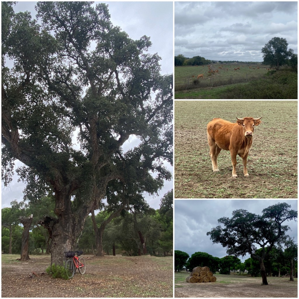 Retrocedo y ahora sí entro por un camino en la Hardada de Palhavã, una gran finca en la que pastan las vacas y en la que después cruzo una zona de alcornoques enormes, probablemente centenarios.