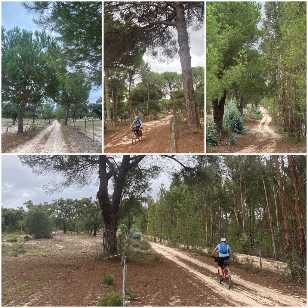 Salgo por el otro lado de la finca y continúo circulando por un laberinto de senderos, a ratos arenosos y a ratos con algo de barro, pero muy agradables. Avanzo durante kilómetros por todo tipo de masas forestales: pinos, alcornoques, encinas, eucaliptos… Es muy bonito.