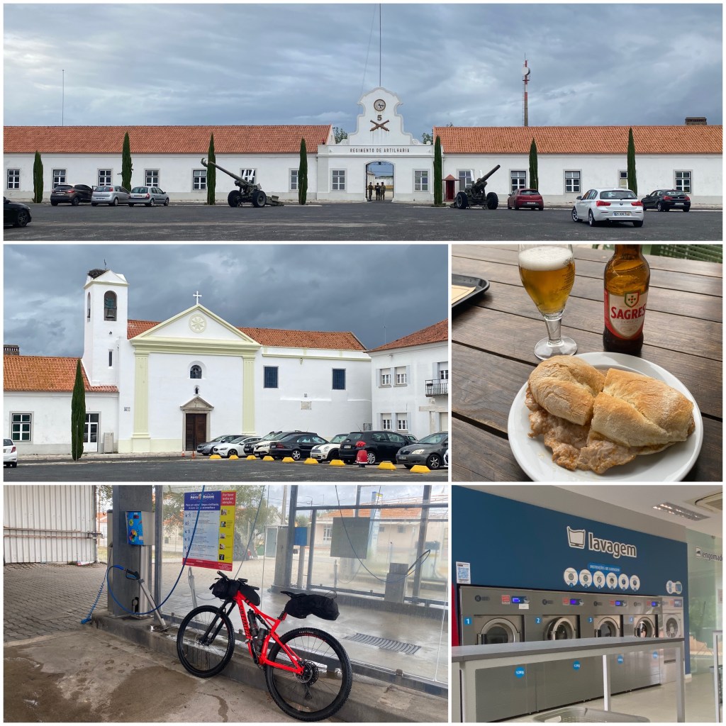 Y en Vendas Novas termino esta etapa “de descanso”, una ciudad relativamente moderna y sin excesivo interés histórico y cuyo edificio más destacado es el Palácio das Passagens, un palacio real del siglo XVI que alberga hoy día la academia de artillería. Aprovecho que hoy llego pronto al destino para dar un manguerazo a la bici, lavar la ropa, degustar una “bifana”, un bocadillo de lomo que es la gran especialidad de la zona, y descansar, descansar mucho para afrontar las próximas etapas, que no serán tan plácidas como la de hoy.