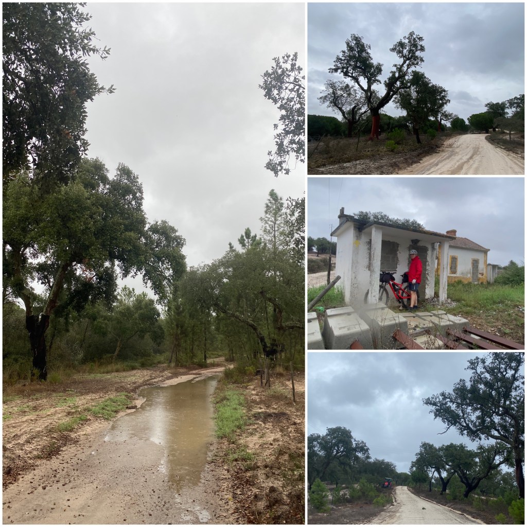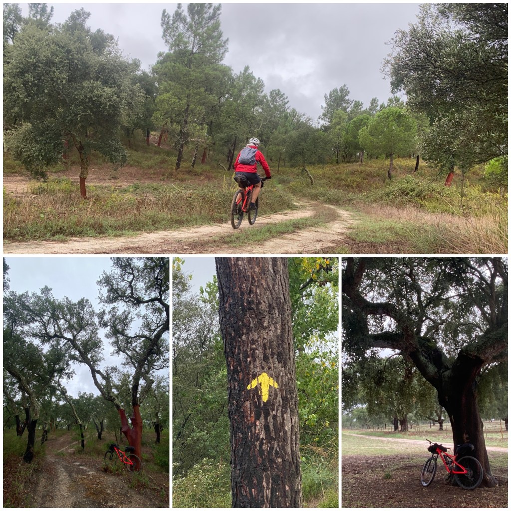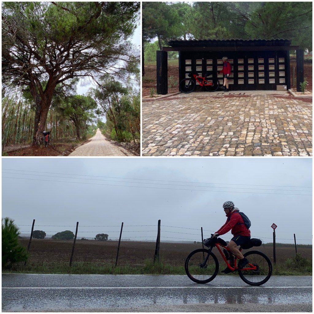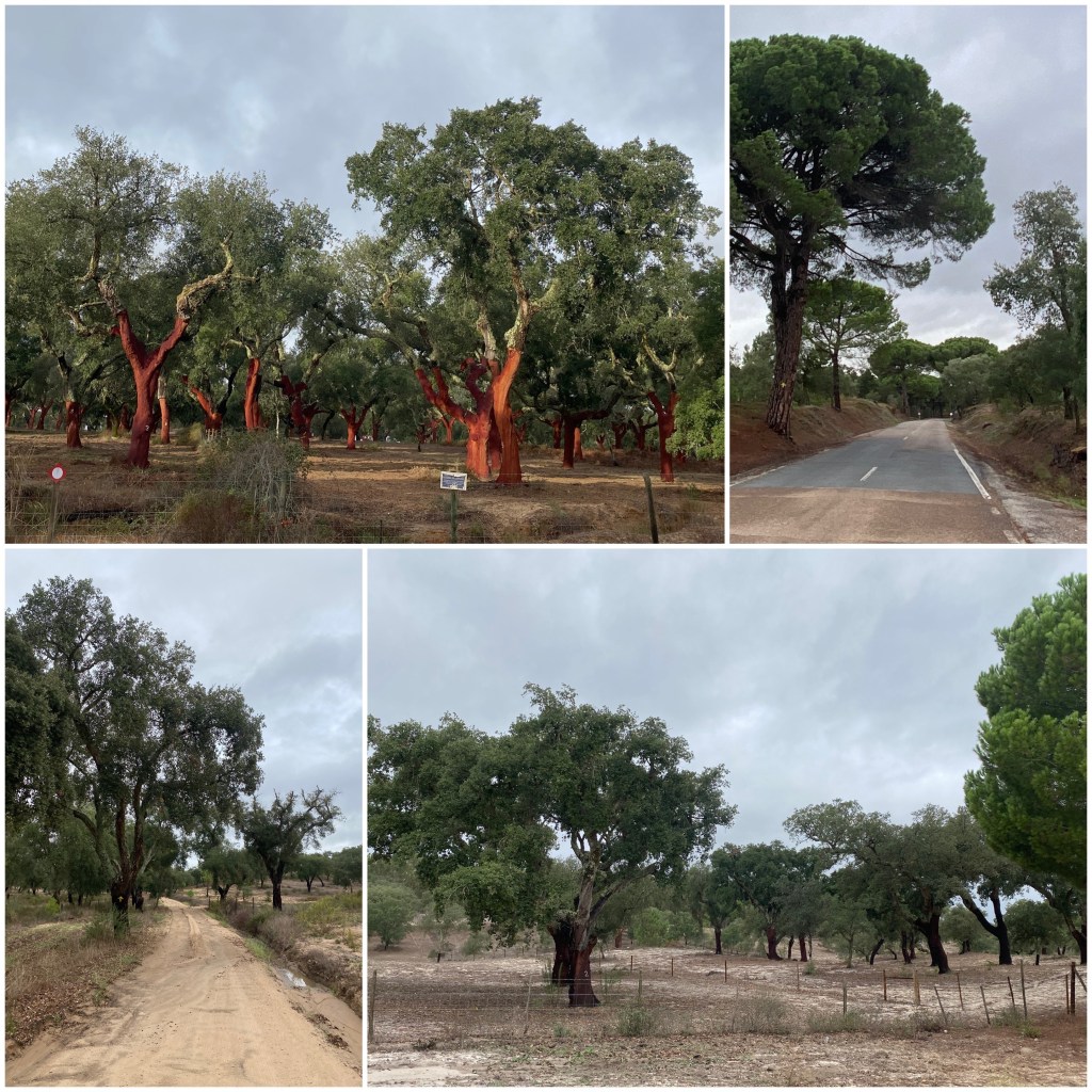 Durante la noche ha llovido y cuando me pongo en marcha hace más fresco que ningún otro día y, además, bastante viento. Los primeros diez kilómetros voy siguiendo una carretera local, probablemente el tramo más largo de asfalto que he hecho en este camino desde que salí de Faro. Cuando la abandono, tomo una pista que recorre una gran finca con plantaciones de pinos y alcornoques. El camino es un poco arenoso.
