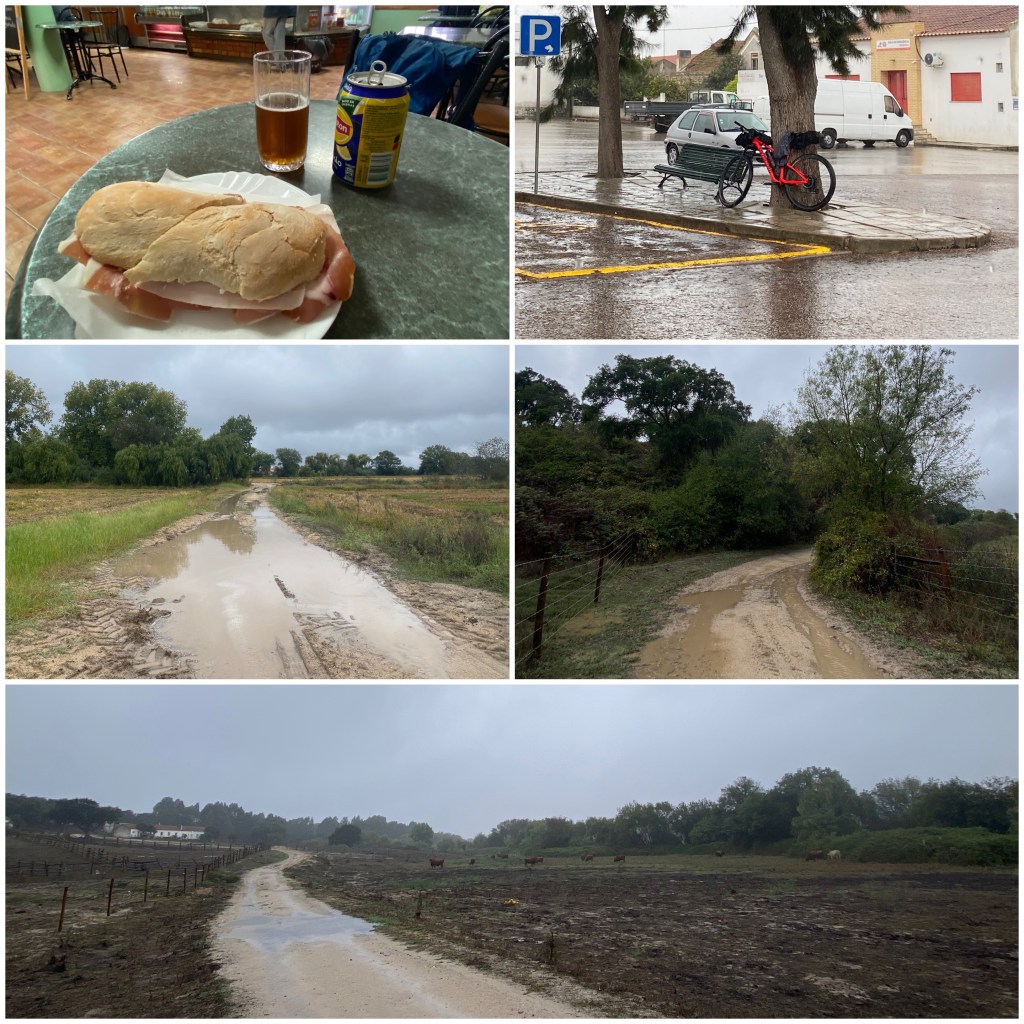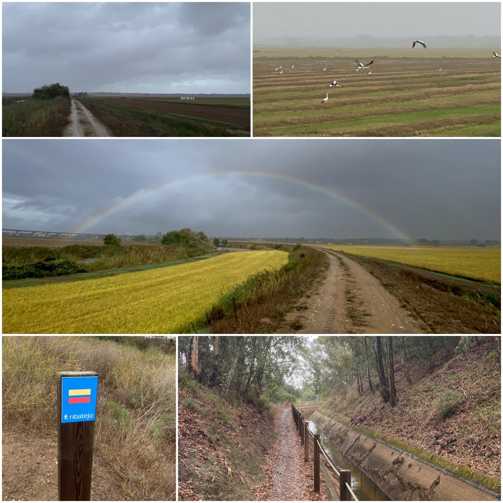 Mojado y rebozado en barro afronto los últimos diez kilómetros de día, esta vez por un sendero por la vega del río Sorraia. De hecho, el que había seguido antes, el Almansor, es afluente de éste que, a su vez, desemboca en el Tejo (el Tajo) a pocos kilómetros de aquí. Durante el recorrido junto al río, las horas de pedaleo bajo la lluvia se ven compensadas por un precioso arcoíris.