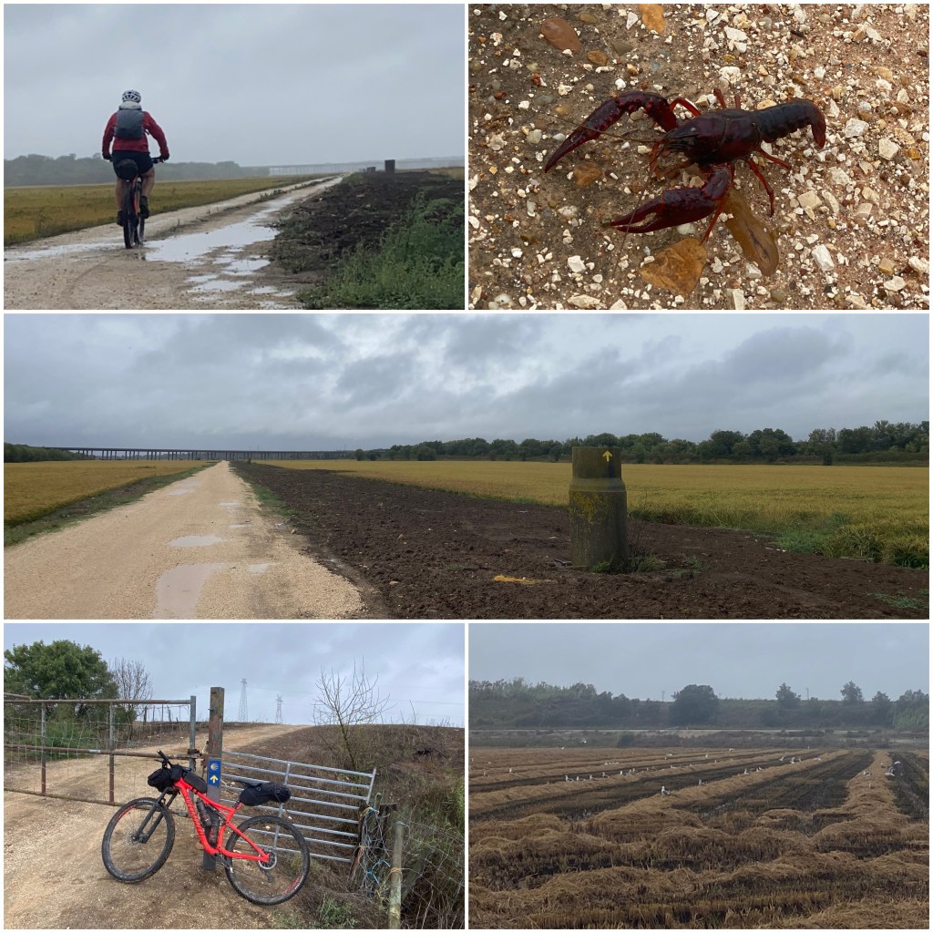 Y luego, durante varios kilómetros, por un camino que va recorriendo la vega del río Almansor, cruzando extensos arrozales. A medida que avanzo he de ir esquivando unos cangrejos rojos que cruzan la pista y que me da la impresión que es una especie invasora, ¡hay muchísimos!