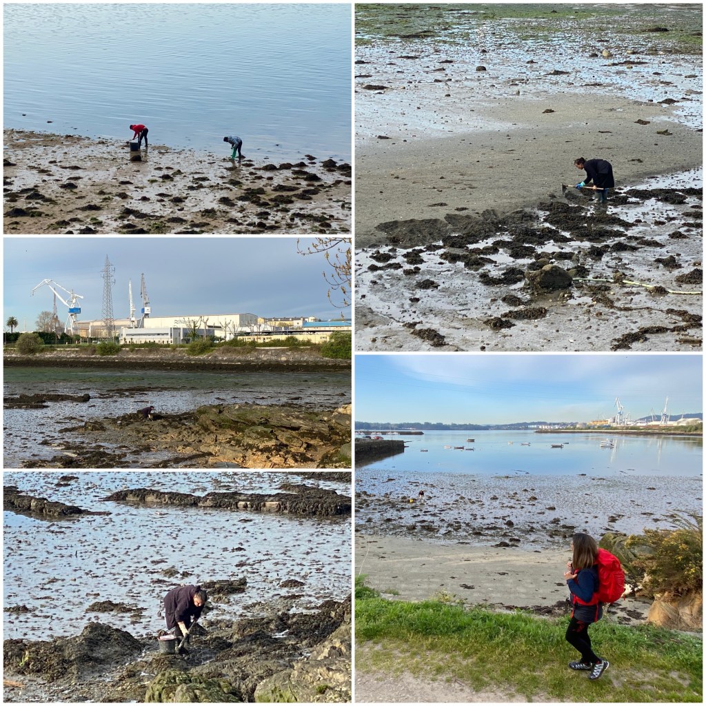 Aún en la ciudad el camino continúa por el borde de la ría. Al pasar por la playa de Caranza vemos mariscadoras que aprovechan la marea baja para rebuscar entre la arena, ajenas a los astilleros que tienen detrás.