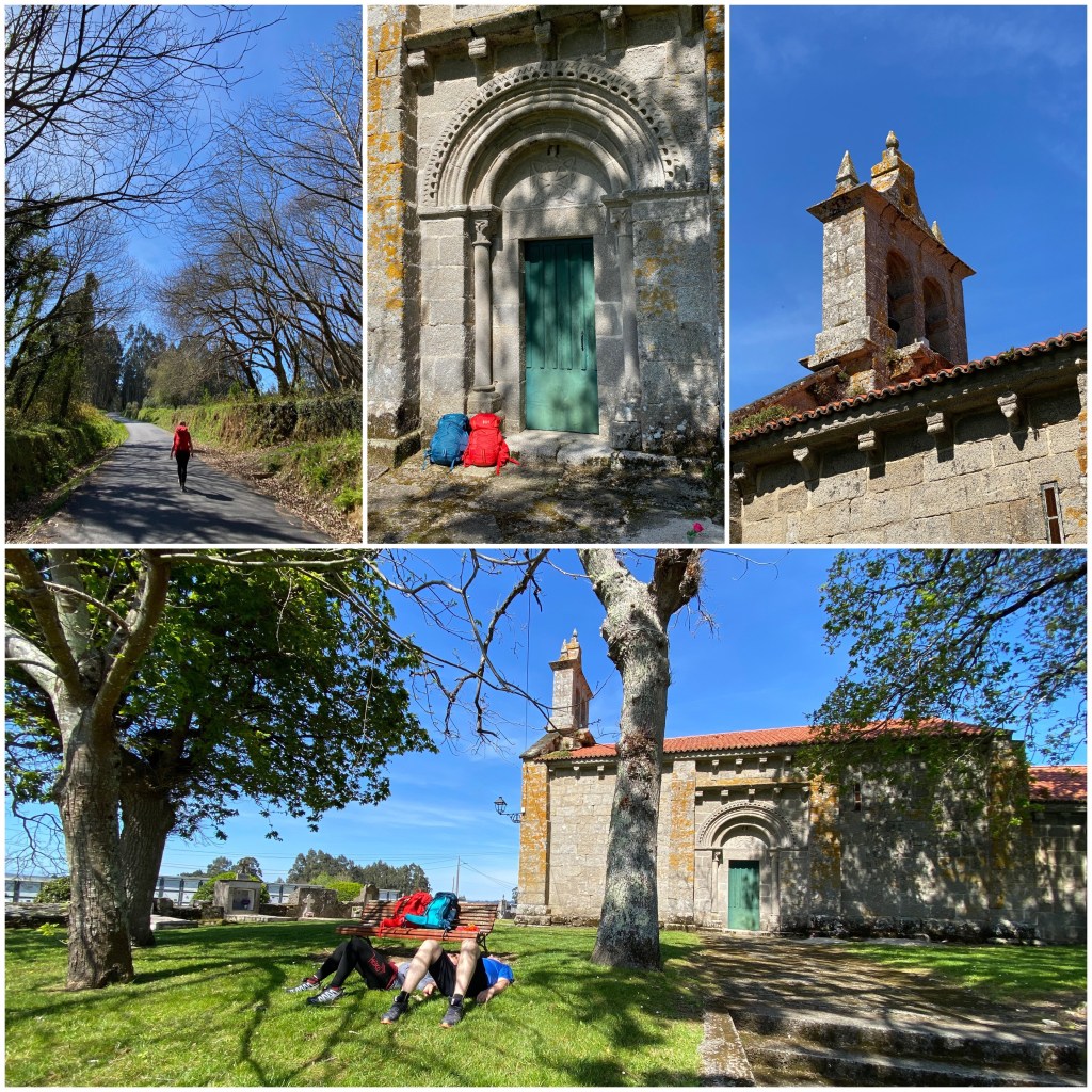 Un par de kilómetros antes de finalizar la etapa pasamos por la iglesia medieval de San Martiño de Tiobre, a cuya sombra paramos un rato a descansar. Como es tradicional en Galicia, las lápidas del cementerio rodean la iglesia.