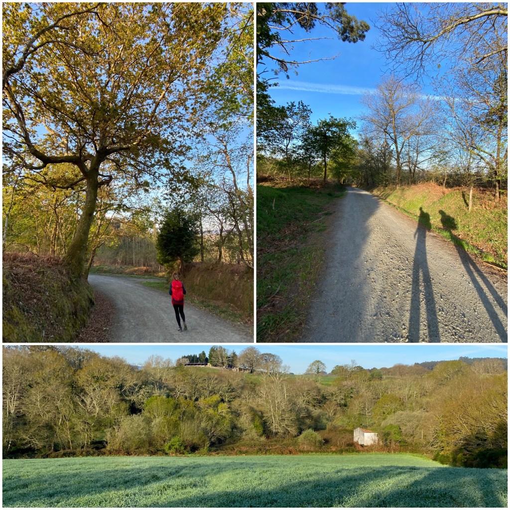 A la salida de Sigüeiro cruzamos el río Tambre y avanzamos un par de kilómetros por asfalto antes de tomar una pista de tierra a través de un paisaje similar al de ayer, con campos labrados y casas aisladas. Una vez más la mañana es muy fría mientras afrontamos la última etapa de este camino.