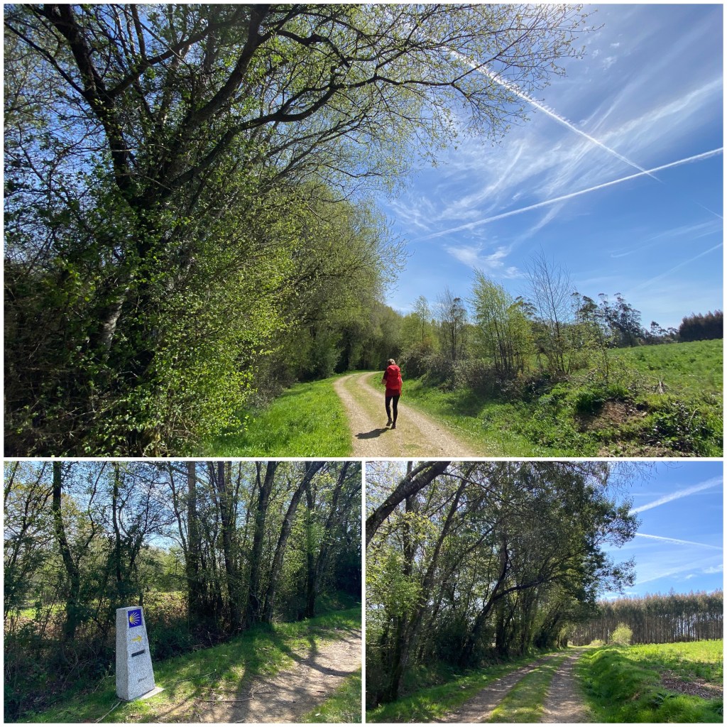 Seguimos recorriendo kilómetros, cruzando una zona bastante llana con campos de maíz, pastos y casas aisladas. Los tramos más bonitos son cuando cambiamos momentáneamente el asfalto por corredoiras o por pistas forestales.