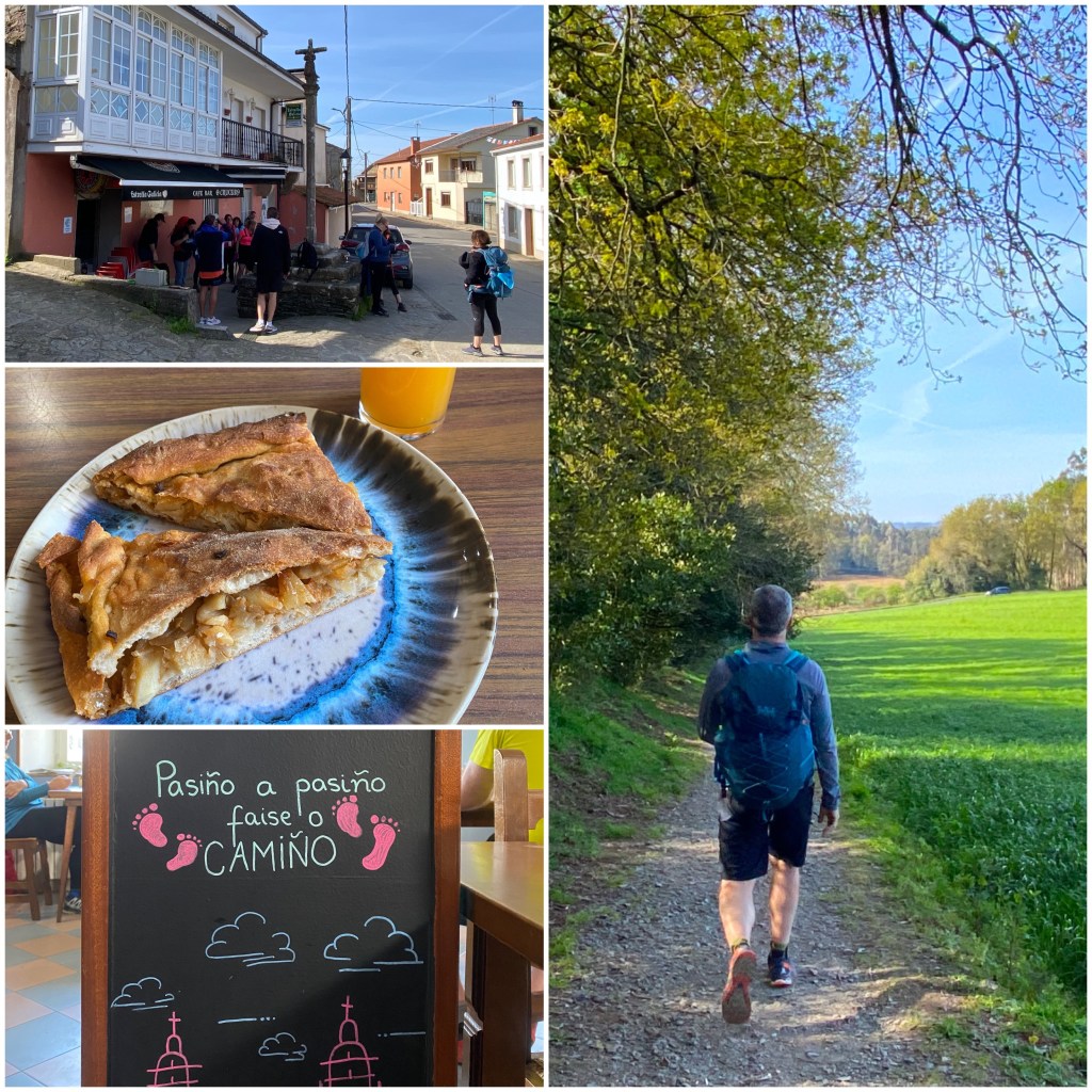 Combinando pistas de tierra y asfaltadas llegamos a A Calle donde el bar O Cruceiro hace de punto de reunión de peregrinos, ya que es el último que encontraremos hasta el final de la etapa. Aprovechamos para probar una empanada gallega deliciosa.