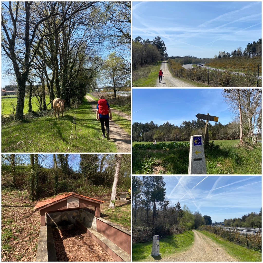 Al final de la etapa hay un tramo algo más pesado en el que durante unos cuatro kilómetros se circula por un andadero paralelo a la autopista AP9, la misma que nos ha acompañado desde que salimos de Ferrol y que hemos tenido que cruzar varias veces en estos días. El camino está bien acondicionado y en algunos momentos ni siquiera se ve la autopista, pero el ruido de los coches es constante y nos recuerda que está ahí al lado.