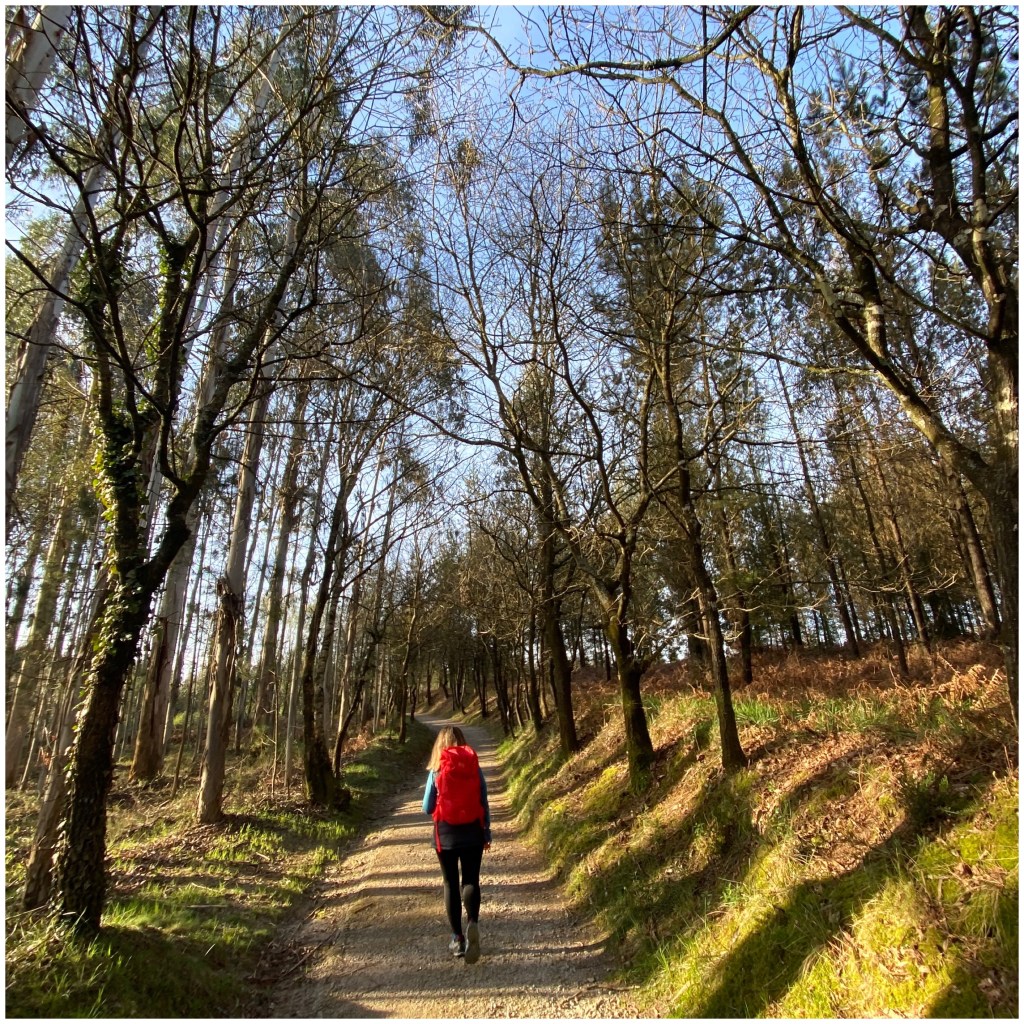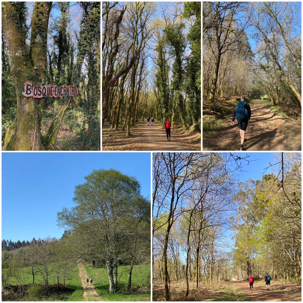 Tras la parada afrontamos un kilómetro de sendero por un bosque que alguien ha bautizado como “Bosque Encantado”. No es más bonito que muchos otros que hemos pasado estos días, especialmente en la etapa de ayer, pero sí que tiene el encanto de ser la última área natural que pasaremos antes de desembocar en el enorme polígono industrial de Tambre, antesala de la zona urbana de la ciudad.