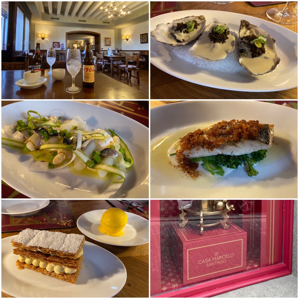 Ya solo queda celebrarlo, así que lo primero que hacemos es tomarnos una cervecita en la cafetería del magnífico parador de Santiago, nacido como hospital de peregrinos en el siglo XVI y considerado el hotel más antiguo de España. Después, con nuestros amigos Mónica y Jorge que han venido desde Coruña, nos damos un homenaje en Casa Marcelo, uno de los mejores restaurantes de la ciudad, ¡nos lo hemos ganado!