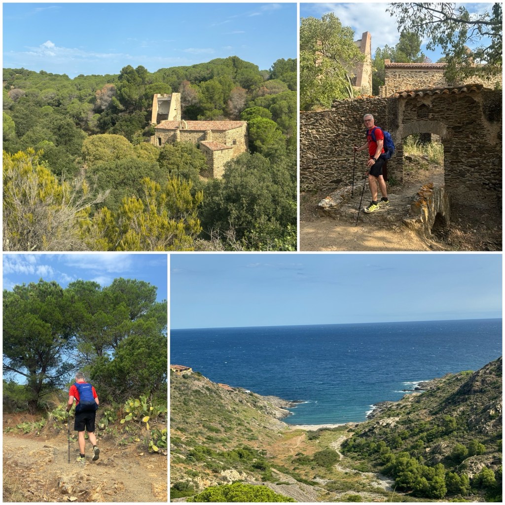 Tras seis kilómetros llego al Monasterio de Sant Quirze de Colera, en proceso de restauración y que, como el de Sant Pere de Rodes por donde pasé ayer, perteneció originariamente a la orden benedictina. Pasado el templo se inicia un fuerte ascenso combinando pistas y senderos. Algunos tramos son tan estrechos, invadidos por la maleza, que cuesta pasar.