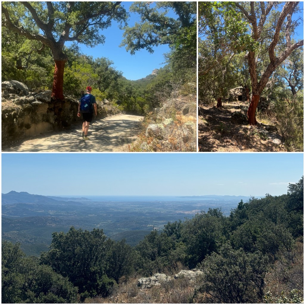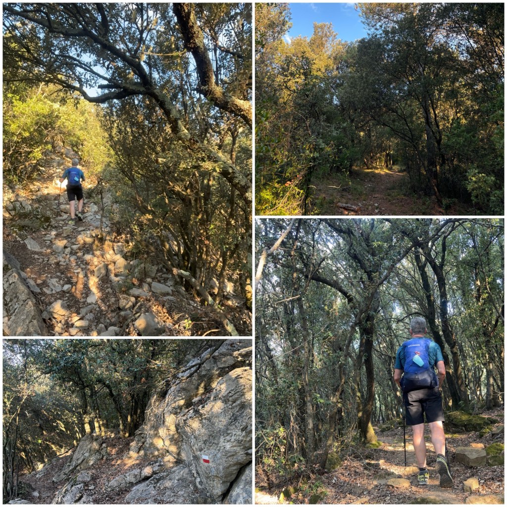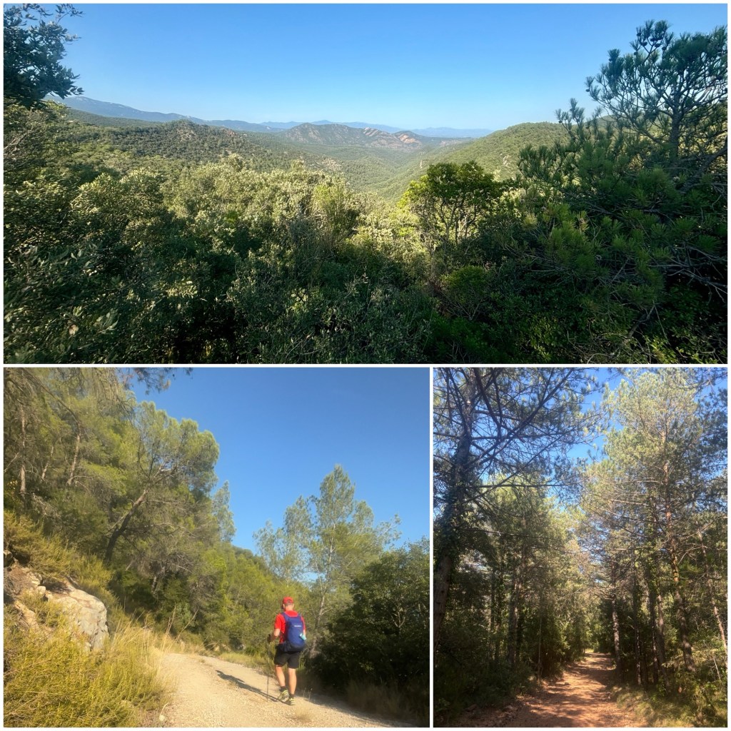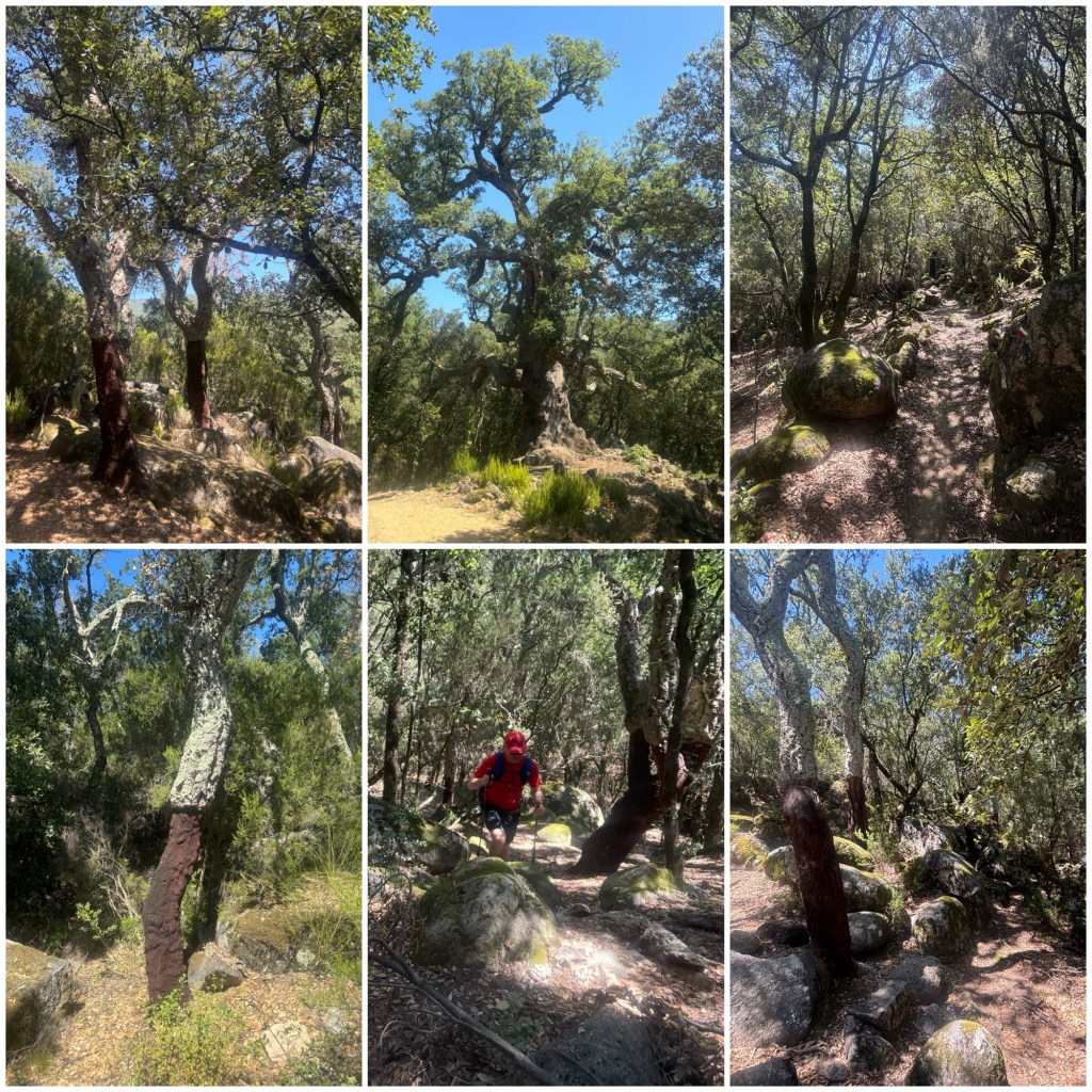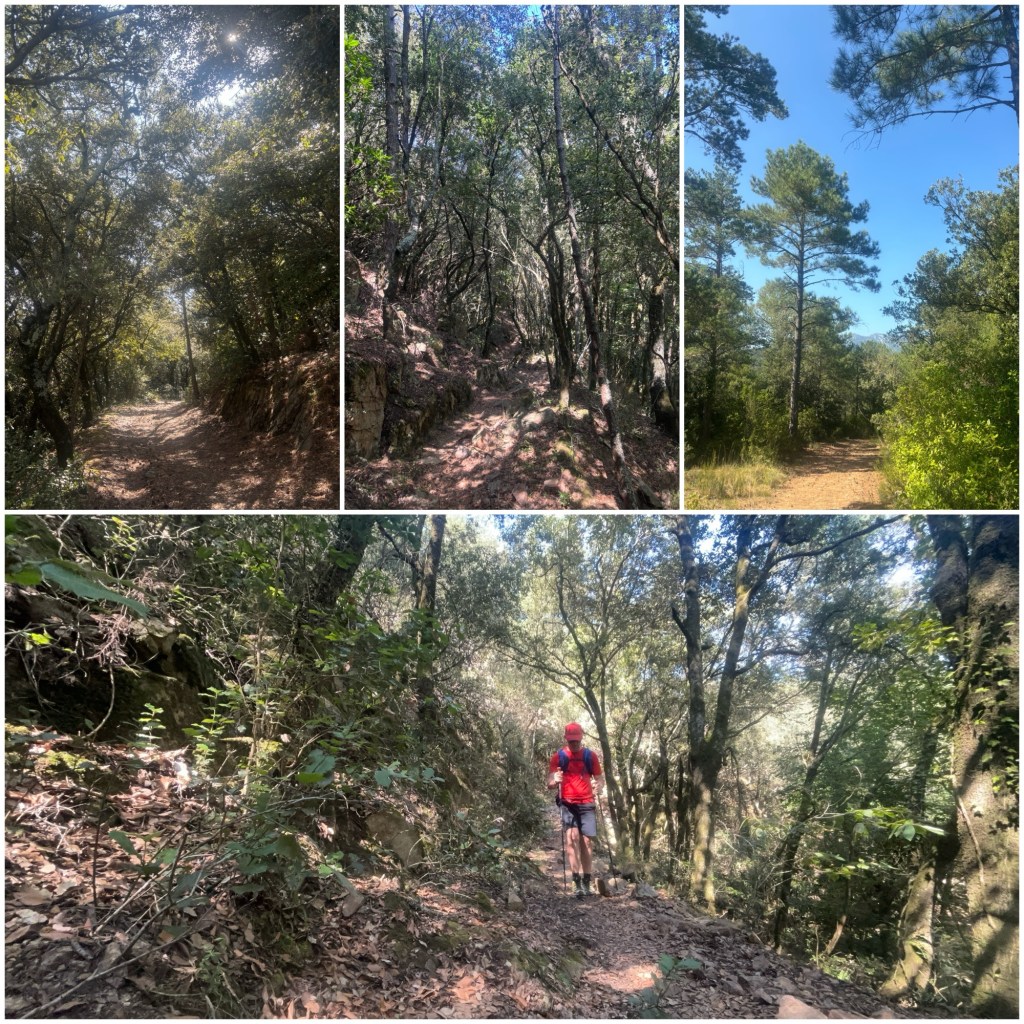 Aunque se desciende levemente, enseguida se empieza la ascensión a un nuevo alto, la Collada de la Trilla. Sin embargo, la subida es mucho más amena, ya que se deja la pista y se hace mayoritariamente por senderos por el bosque que, además de ser más bonitos y más divertidos, están casi siempre en sombra. La diferencia de temperatura es abismal. En este bosque noto como la vegetación poco a poco va cambiando y, por primera vez, además de los alcornoques empiezan a predominar los pinos.
