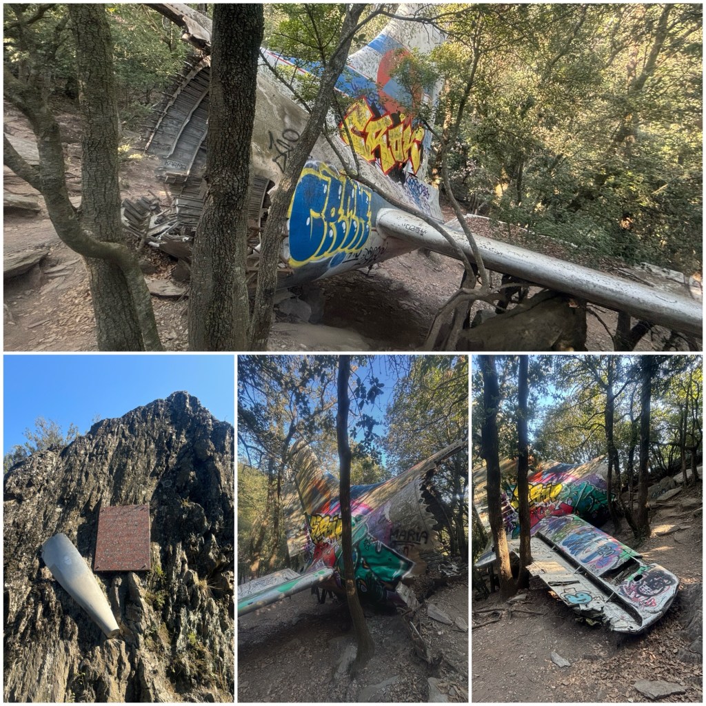 Continúo por pista forestal ascendiendo a un nuevo alto, el último de la jornada. La subida es larga pero progresiva y por el camino se pasa junto a los restos de una avioneta, un DC-6, que se estrelló en 1986 cuando participaba en las labores de extinción de un incendio forestal, falleciendo sus cuatro ocupantes. Una placa los recuerda.