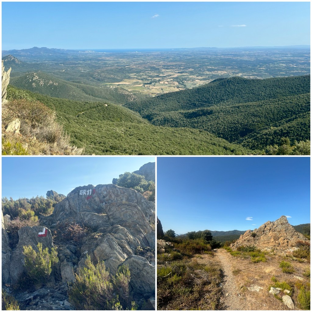 El entorno continúa siendo mediterráneo, todavía muy diferente a lo que asociaríamos con el paisaje pirenaico típico. El ascenso termina en un alto, el Coll de la Plaja, desde donde me doy cuenta, mirando hacia atrás, que a lo lejos se ve el mar, así que me precipité cuando ayer escribí que desde el Coll de Ses Portes, pasado Llançà, los que vienen del Cantábrico contemplarían por primera vez el Mediterráneo. Es cierto, sin embargo, que desde allí se ve “a tocar”, mientras que desde aquí es una imagen borrosa en la distancia que, además, corresponde al golfo de Roses, al sur de la Península del Cap de Creus, y no a la parte del Mediterráneo, más al norte, donde acabarán finalmente llegando al mar los que finalicen el GR11.